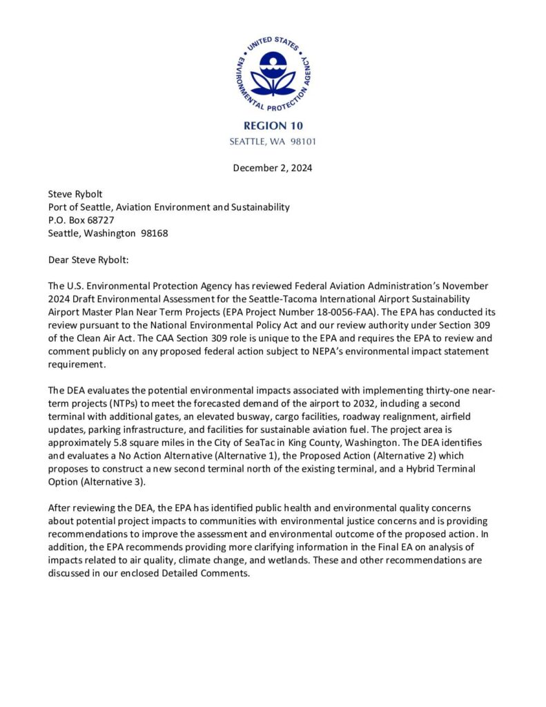 Port of Seattle, Aviation Environment and Sustainability P.O. Box 68727 Seattle, Washington 98168 Dear Steve Rybolt: The U.S. Environmental Protection Agency has reviewed Federal Aviation Administration’s November 2024 Draft Environmental Assessment for the Seattle-Tacoma International Airport Sustainability Airport Master Plan Near Term Projects (EPA Project Number 18-0056-FAA). The EPA has conducted its review pursuant to the National Environmental Policy Act and our review authority under Section 309 of the Clean Air Act. The CAA Section 309 role is unique to the EPA and requires the EPA to review and comment publicly on any proposed federal action subject to NEPA’s environmental impact statement requirement. The DEA evaluates the potential environmental impacts associated with implementing thirty-one near- term projects (NTPs) to meet the forecasted demand of the airport to 2032, including a second terminal with additional gates, an elevated busway, cargo facilities, roadway realignment, airfield updates, parking infrastructure, and facilities for sustainable aviation fuel. The project area is approximately 5.8 square miles in the City of SeaTac in King County, Washington. The DEA identifies and evaluates a No Action Alternative (Alternative 1), the Proposed Action (Alternative 2) which proposes to construct a new second terminal north of the existing terminal, and a Hybrid Terminal Option (Alternative 3). After reviewing the DEA, the EPA has identified public health and environmental quality concerns about potential project impacts to communities with environmental justice concerns and is providing recommendations to improve the assessment and environmental outcome of the proposed action. In addition, the EPA recommends providing…