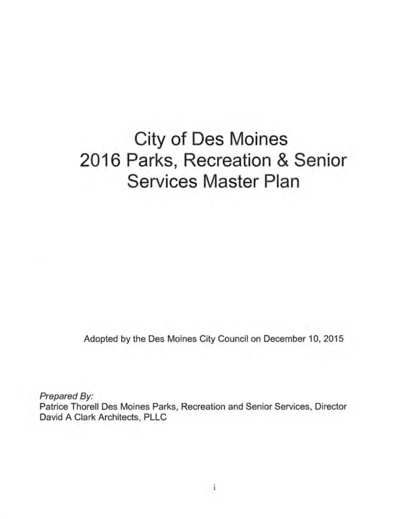 Adopted by the Des Moines City Council on December 10, 2015 Prepared By: Patrice Thorell Des Moines Parks, Recreation and Senior Services, Director David A Clark Architects, PLLC Table of Contents Authorization Acknowledgements Executive Summary Section 1 Existing Conditions 1.1 Resources .2 Programs & Services .3 Master Plan Process 1.4 Population & Demographics 1.5 Current Planning Activity Section 2 Needs Assessment 2.1 Surveys - Public Process 2.2 Demand Analysis 2.3 Assessment of Needs 2.4 Levels of Service 2.5 Parks Classification Standards 2.6 Needs Statement 2.7 Des Moines Transportation Plan Bikeway Network vii vii X Section 3 Parks, Recreation & Senior Services Facilities and Operations Objectives 3.1 Parks, Recreation & Senior Services Acquisition & Development Priorities 33 3.2 Park & Facilities Land Acquisition 35 3.3 Facilities Renovation/Repair 36 3.4 New Development Objectives 39 3.5 Vision, Mission and Imperatives 43 3.6 Parks, Recreation & Senior Services Administration 44 3.7 Recreation Division 45 3.8 Recreation Events & Facilities Division 46 3.9 Senior Programs and Services 47 3.10 Park Operations/Maintenance 48 Section 4 Costs & Funding 52 4.1 Parks, Recreation & Senior Services Development Costs 52 4.2 Maintenance Costs 54 4.3 Administration and Recreation Service Costs 55 4.4 Funding Programs 56 4.5 Potential Funding Sources 58 Section 5 Goals, Policy & Implementation Strategies & Parks, Recreation & Senior Services Standards 61 Chapter 6: Parks, Recreation & Open Space Element GOALS 6-1 POLICIES AND IMPLEMTATION STRATEGIES 6-3 111 Appendices Appendix A Citizen Surveys Appendix B Park Review Plan Appendix C Park Projects Summary/Park Cost Estimates…