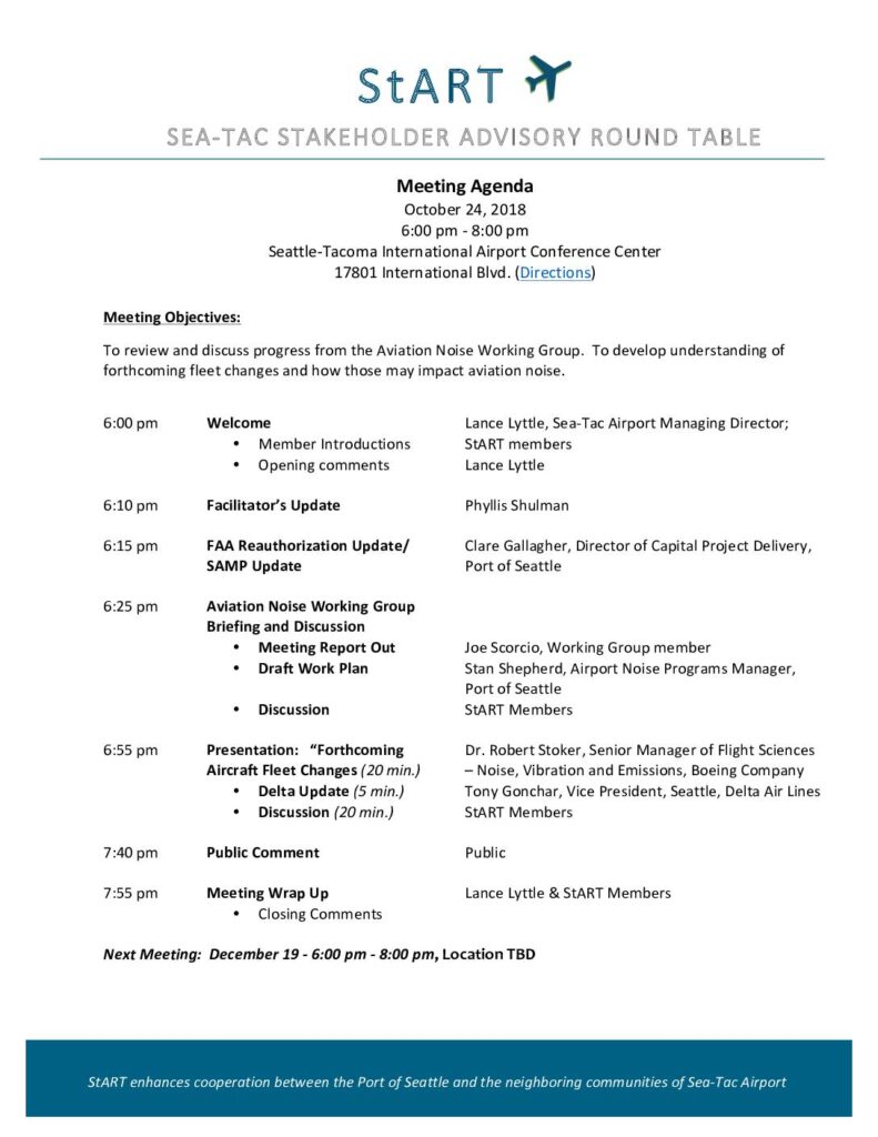 StART enhances cooperation between the Port of Seattle and the neighboring communities of Sea-Tac Airport Meeting Agenda October 24, 2018 6:00 pm - 8:00 pm Seattle-Tacoma International Airport Conference Center 17801 International Blvd. (Directions) Meeting Objectives: To review and discuss progress from the Aviation Noise Working Group. To develop understanding of forthcoming fleet changes and how those may impact aviation noise. 6:00 pm Welcome Lance Lyttle, Sea-Tac Airport Managing Director; • Member Introductions StART members • Opening comments Lance Lyttle 6:10 pm Facilitator’s Update Phyllis Shulman 6:15 pm FAA Reauthorization Update/ Clare Gallagher, Director of Capital Project Delivery, SAMP Update Port of Seattle 6:25 pm Aviation Noise Working Group Briefing and Discussion • Meeting Report Out Joe Scorcio, Working Group member • Draft Work Plan Stan Shepherd, Airport Noise Programs Manager, Port of Seattle • Discussion StART Members 6:55 pm Presentation: “Forthcoming Dr. Robert Stoker, Senior Manager of Flight Sciences Aircraft Fleet Changes (20 min.) – Noise, Vibration and Emissions, Boeing Company • Delta Update (5 min.) Tony Gonchar, Vice President, Seattle, Delta Air Lines • Discussion (20 min.) StART Members 7:40 pm Public Comment Public 7:55 pm Meeting Wrap Up Lance Lyttle & StART Members • Closing Comments Next Meeting: December 19 - 6:00 pm - 8:00 pm, Location TBD