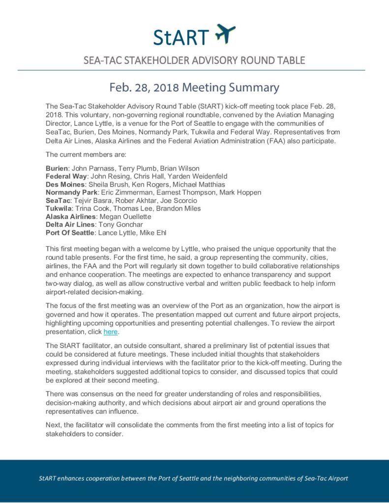 StART enhances cooperation between the Port of Seattle and the neighboring communities of Sea‐Tac Airport Feb. 28, 2018 Meeting Summary The Sea-Tac Stakeholder Advisory Round Table (StART) kick-off meeting took place Feb. 28, 2018. This voluntary, non-governing regional roundtable, convened by the Aviation Managing Director, Lance Lyttle, is a venue for the Port of Seattle to engage with the communities of SeaTac, Burien, Des Moines, Normandy Park, Tukwila and Federal Way. Representatives from Delta Air Lines, Alaska Airlines and the Federal Aviation Administration (FAA) also participate. The current members are: Burien: John Parnass, Terry Plumb, Brian Wilson Federal Way: John Resing, Chris Hall, Yarden Weidenfeld Des Moines: Sheila Brush, Ken Rogers, Michael Matthias Normandy Park: Eric Zimmerman, Earnest Thompson, Mark Hoppen SeaTac: Tejvir Basra, Rober Akhtar, Joe Scorcio Tukwila: Trina Cook, Thomas Lee, Brandon Miles Alaska Airlines: Megan Ouellette Delta Air Lines: Tony Gonchar Port Of Seattle: Lance Lyttle, Mike Ehl This first meeting began with a welcome by Lyttle, who praised the unique opportunity that the round table presents. For the first time, he said, a group representing the community, cities, airlines, the FAA and the Port will regularly sit down together to build collaborative relationships and enhance cooperation. The meetings are expected to enhance transparency and support two-way dialog, as well as allow constructive verbal and written public feedback to help inform airport-related decision-making. The focus of the first meeting was an overview of the Port as an organization, how the airport is governed and how it operates.…