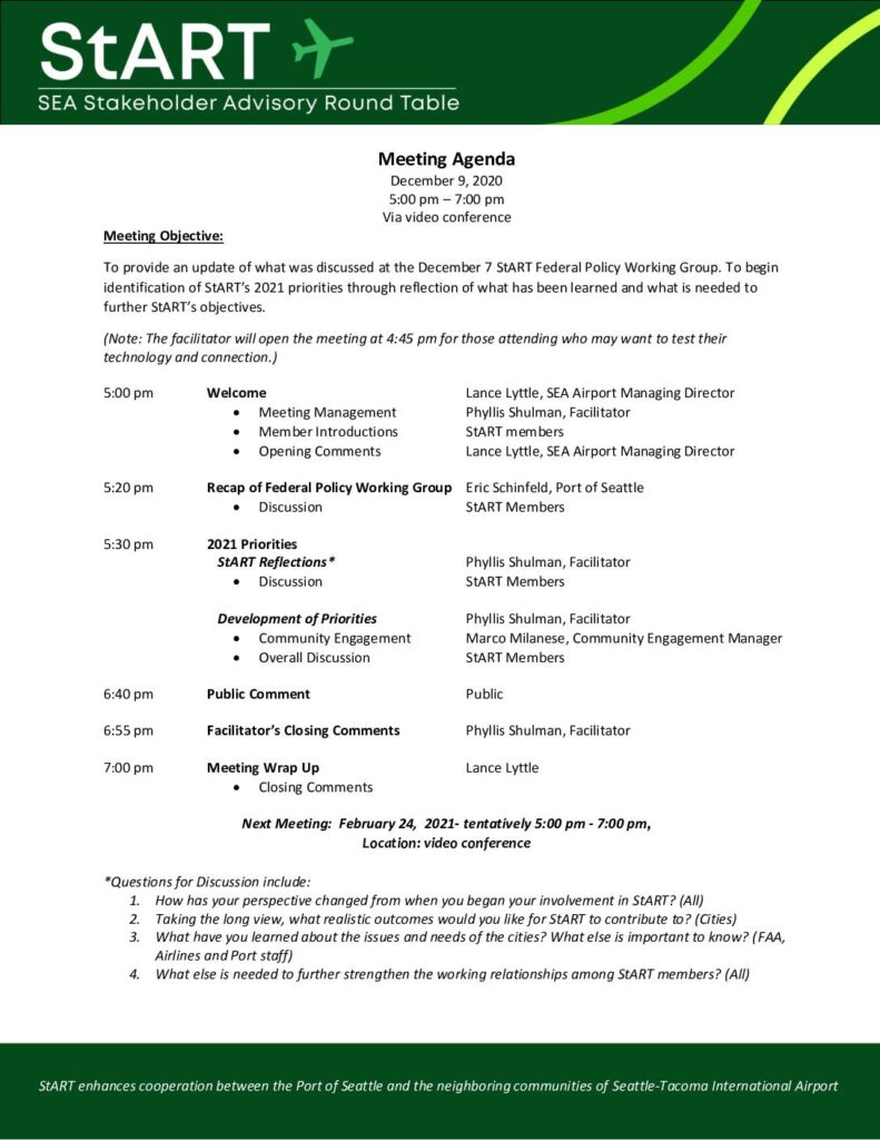 StART enhances cooperation between the Port of Seattle and the neighboring communities of Seattle-Tacoma International Airport Meeting Agenda December 9, 2020 5:00 pm – 7:00 pm Via video conference Meeting Objective: To provide an update of what was discussed at the December 7 StART Federal Policy Working Group. To begin identification of StART’s 2021 priorities through reflection of what has been learned and what is needed to further StART’s objectives. (Note: The facilitator will open the meeting at 4:45 pm for those attending who may want to test their technology and connection.) 5:00 pm Welcome Lance Lyttle, SEA Airport Managing Director • Meeting Management Phyllis Shulman, Facilitator • Member Introductions StART members • Opening Comments Lance Lyttle, SEA Airport Managing Director 5:20 pm Recap of Federal Policy Working Group Eric Schinfeld, Port of Seattle • Discussion StART Members 5:30 pm 2021 Priorities StART Reflections* Phyllis Shulman, Facilitator • Discussion StART Members Development of Priorities Phyllis Shulman, Facilitator • Community Engagement Marco Milanese, Community Engagement Manager • Overall Discussion StART Members 6:40 pm Public Comment Public 6:55 pm Facilitator’s Closing Comments Phyllis Shulman, Facilitator 7:00 pm Meeting Wrap Up Lance Lyttle • Closing Comments Next Meeting: February 24, 2021- tentatively 5:00 pm - 7:00 pm, Location: video conference *Questions for Discussion include: 1. How has your perspective changed from when you began your involvement in StART? (All) 2. Taking the long view, what realistic outcomes would you like for StART to contribute to? (Cities) 3. What have you learned about the…
