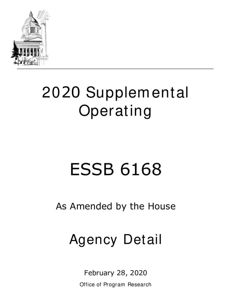 Washington State’s 2020 supplemental operating budget document showing agency-by-agency budget details including FTE staff positions, funds subject to budget outlook, and total budgeted amounts. Covers all state agencies from Legislative and Judicial branches to Public Schools, Higher Education, and other state operations.