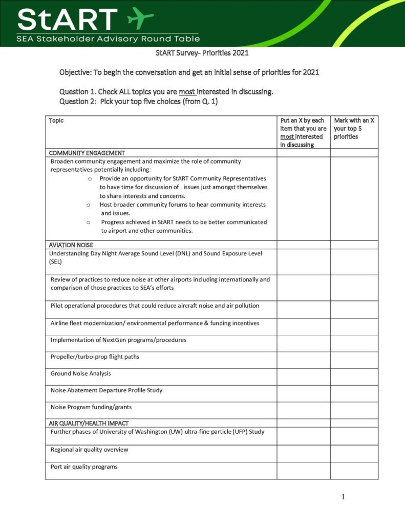 Objective: To begin the conversation and get an initial sense of priorities for 2021 Question 1. Check ALL topics you are most interested in discussing. Question 2: Pick your top five choices (from Q. 1) Topic Put an X by each item that you are most interested in discussing Mark with an X your top 5 priorities COMMUNITY ENGAGEMENT Broaden community engagement and maximize the role of community representatives potentially including: o Provide an opportunity for StART Community Representatives to have time for discussion of issues just amongst themselves to share interests and concerns. o Host broader community forums to hear community interests and issues. o Progress achieved in StART needs to be better communicated to airport and other communities. AVIATION NOISE Understanding Day Night Average Sound Level (DNL) and Sound Exposure Level (SEL)