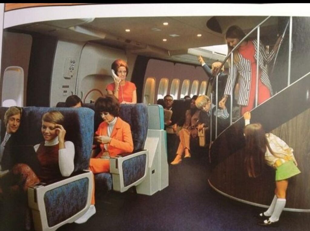 A vintage photograph showing the interior of a commercial aircraft with passengers seated in blue seats and flight attendants in red uniforms. The image depicts the spacious, luxurious airline travel experience of an earlier era with a curved staircase visible in the background.