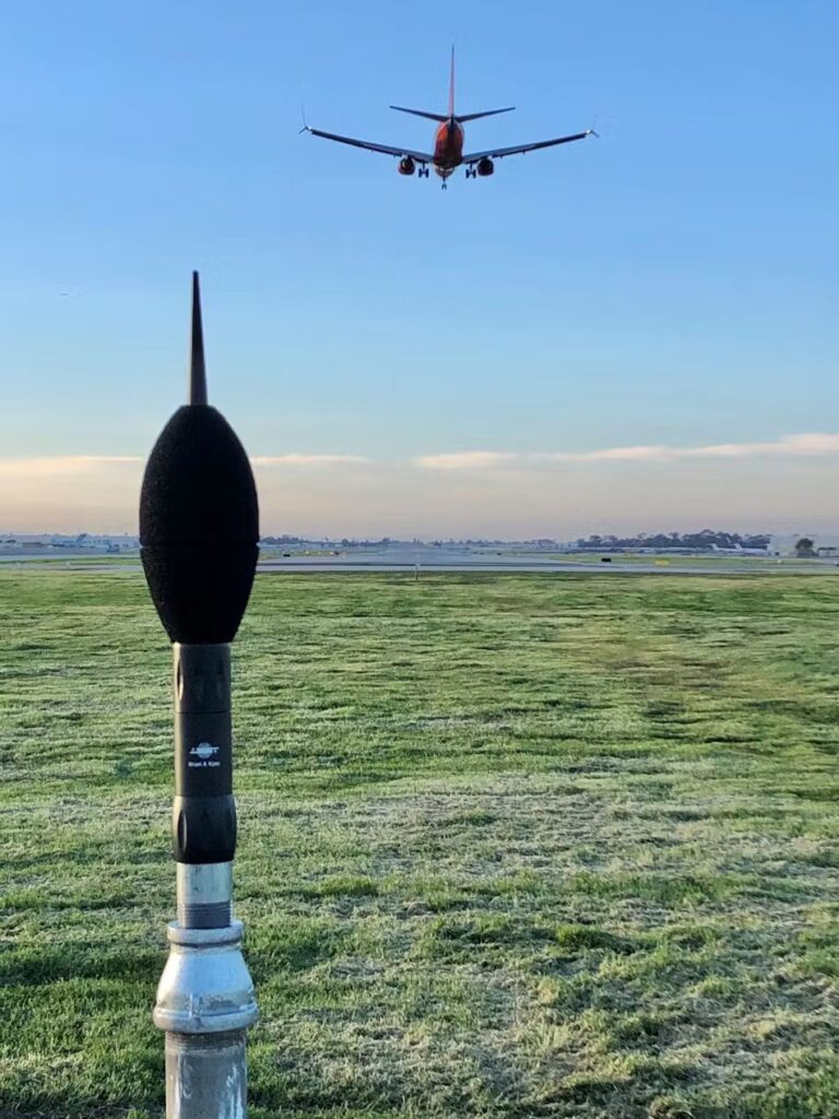 Image showing a commercial aircraft approaching for landing with airport ground equipment visible in the foreground on a grassy field. The photo appears to be taken at an airport during daytime with clear skies.