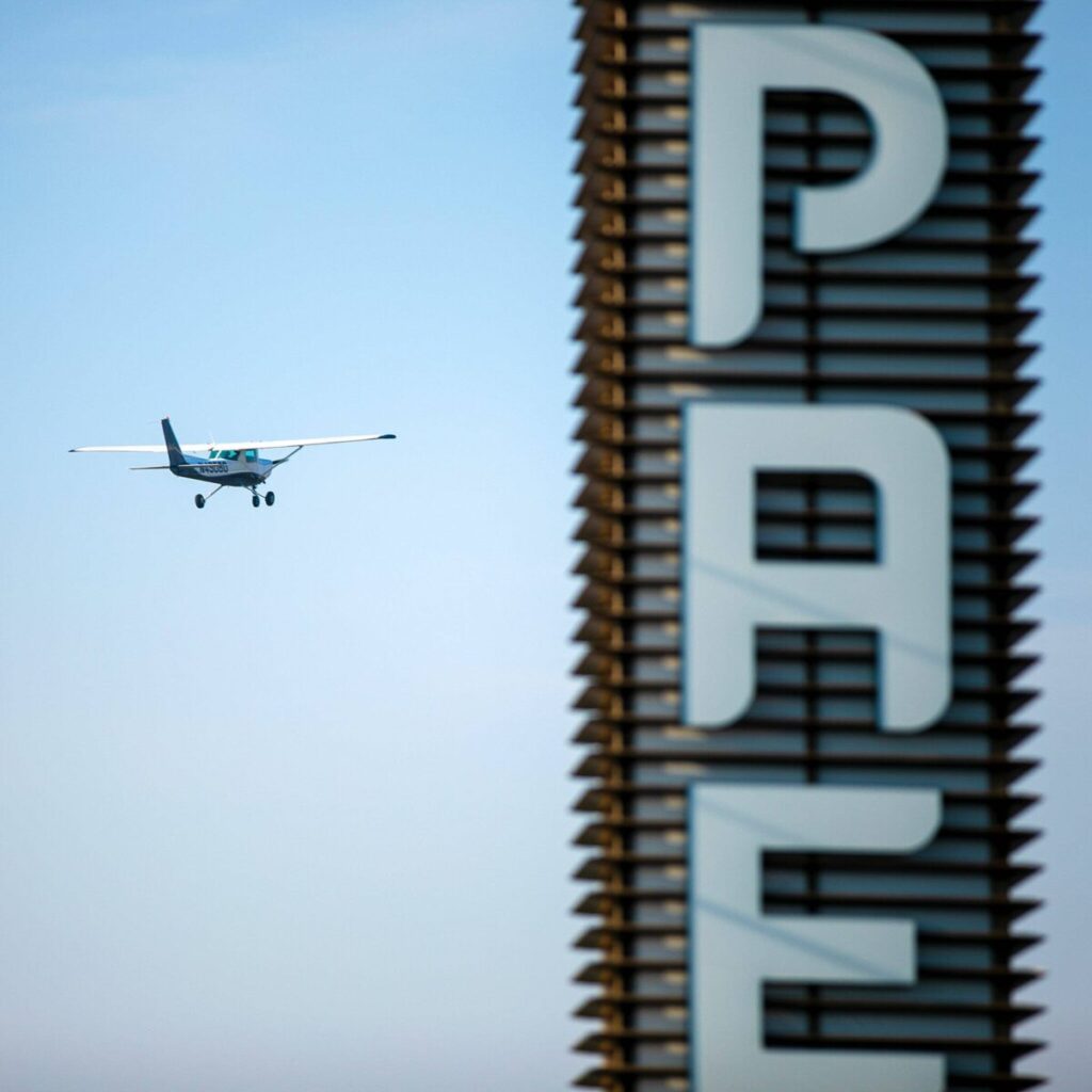 Image shows a small aircraft in flight against a clear sky, with a large airport control tower or structure visible in the foreground. The tower displays partial lettering that appears to be part of airport signage.