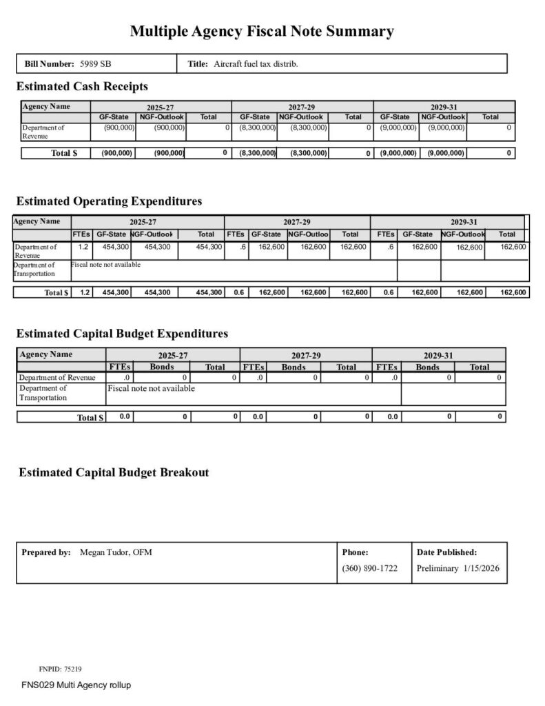 Multiple Agency Fiscal Note for Bill 5989 SB regarding aircraft fuel tax distribution. Shows estimated cash receipts and expenditures for Department of Revenue and Department of Transportation across multiple fiscal periods, with revenue decreases to General Fund and corresponding increases to Aeronautics Account.