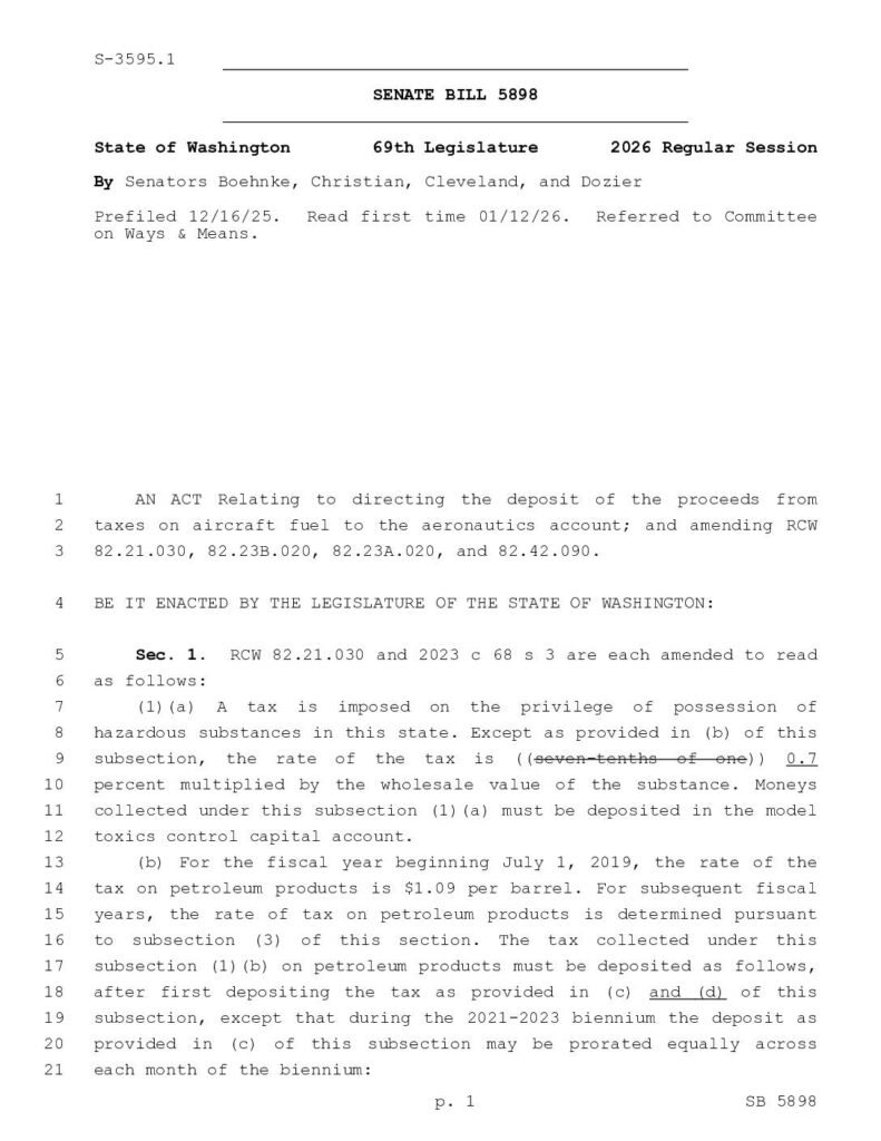 Senate Bill 5898 proposes to direct proceeds from taxes on aircraft fuel to the aeronautics account. The bill amends several RCW sections related to hazardous substance taxes, oil spill response taxes, and other petroleum product taxation, specifically creating provisions for aircraft fuel tax proceeds to be deposited into the aeronautics account.
