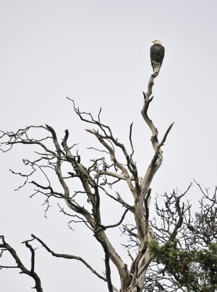 A bald eagle sits perched on the highest branch of a bare, dead tree against an overcast sky. The distinctive white head and dark brown body of the adult bald eagle are clearly visible as it surveys the area from its elevated vantage point.