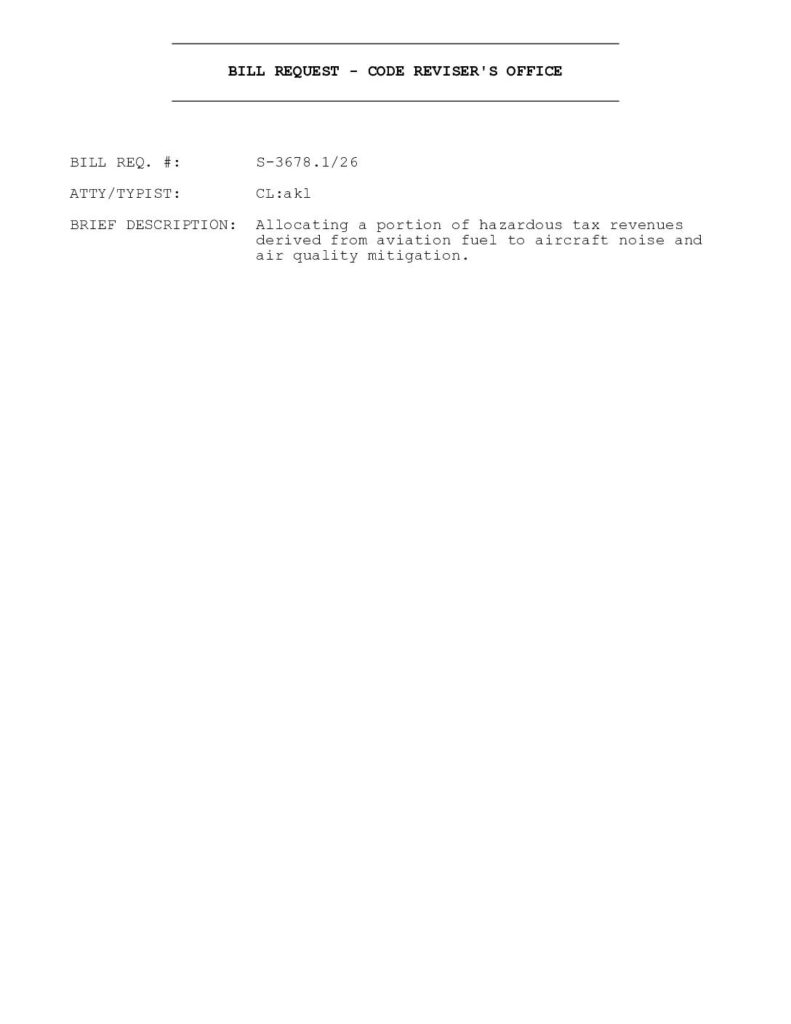 S-3678.1 Bill Request – Allocating a portion of hazardous tax revenues derived from aviation fuel to aircraft noise and air quality mitigation