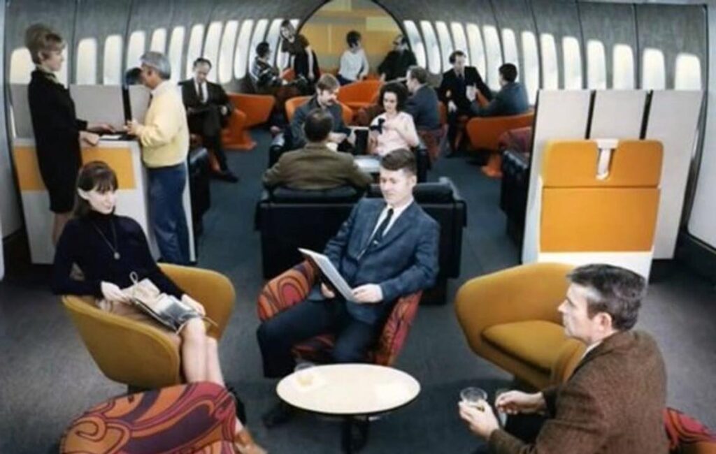 Interior view of a vintage commercial aircraft showing passengers in a lounge-style seating arrangement with orange and yellow chairs, curved windows, and 1960s-70s era design aesthetic. The spacious cabin features comfortable seating areas with passengers reading and socializing.
