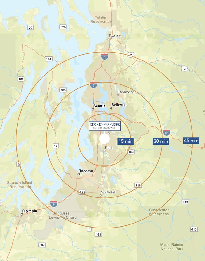Kent, Seatac:                              15 minutesSeattle, Auburn, Renton:           30 minutesLakewood, Shoreline, Bothell:  45 minutes