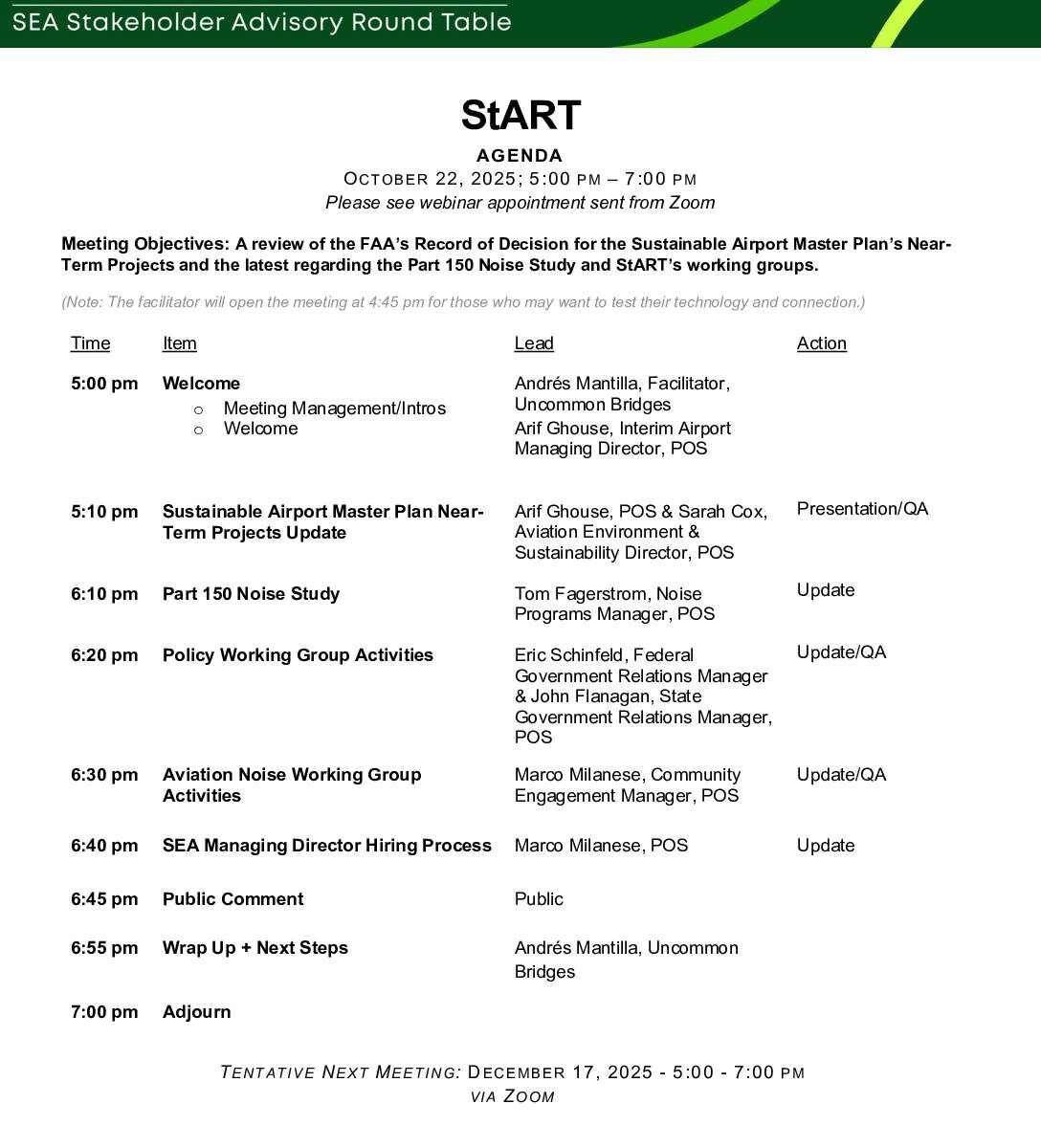 Meeting Objectives: A review of the FAA’s Record of Decision for the Sustainable Airport Master Plan’s Near Term Projects and the latest regarding the Part 150 Noise Study and StART’s working groups.