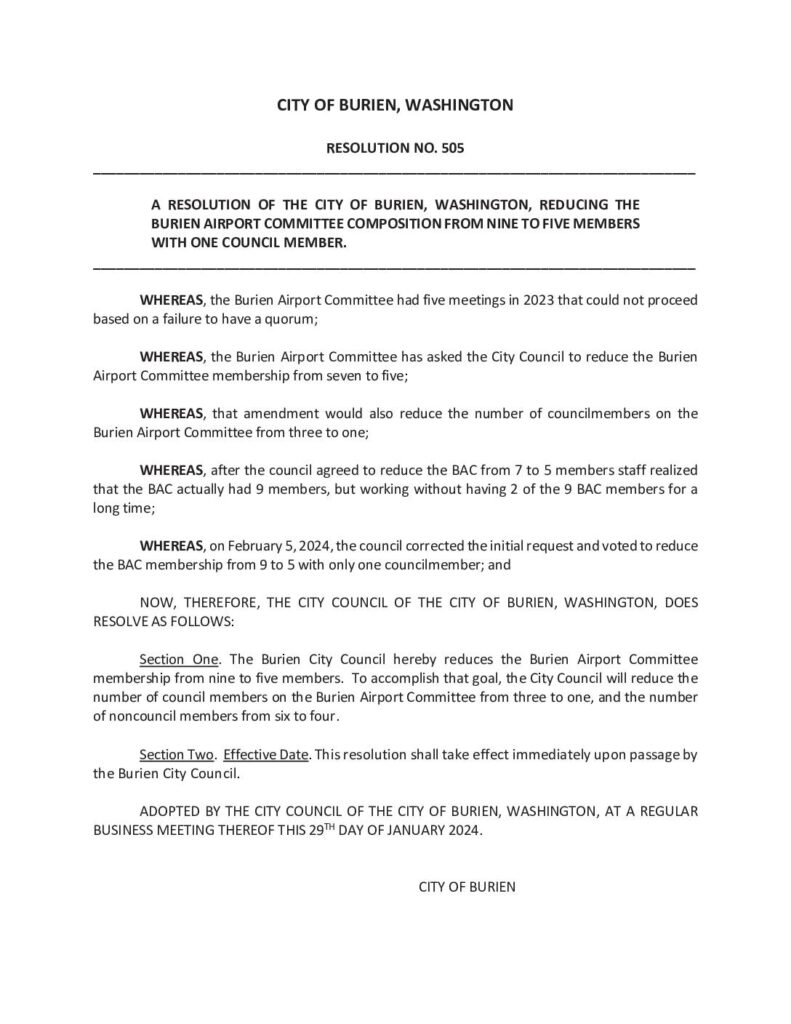 WHEREAS, the Burien Airport Committee had five meetings in 2023 that could not proceed based on a failure to have a quorum; WHEREAS, the Burien Airport Committee has asked the City Council to reduce the Burien Airport Committee membership from seven to five; WHEREAS, that amendment would also reduce the number of councilmembers on the Burien Airport Committee from three to one; WHEREAS, after the council agreed to reduce the BAC from 7 to 5 members staff realized that the BAC actually had 9 members, but working without having 2 of the 9 BAC members for a long time; WHEREAS, on February 5, 2024, the council corrected the initial request and voted to reduce the BAC membership from 9 to 5 with only one councilmember; and NOW, THEREFORE, THE CITY COUNCIL OF THE CITY OF BURIEN, WASHINGTON, DOES RESOLVE AS FOLLOWS: Section One. The Burien City Council hereby reduces the Burien Airport Committee membership from nine to five members. To accomplish that goal, the City Council will reduce the number of council members on the Burien Airport Committee from three to one, and the number of noncouncil members from six to four. Section Two. Effective Date. This resolution shall take effect immediately upon passage by the Burien City Council. ADOPTED BY THE CITY COUNCIL OF THE CITY OF BURIEN, WASHINGTON, AT A REGULAR BUSINESS MEETING THEREOF THIS 29TH DAY OF JANUARY 2024. CITY OF BURIEN Resolution No. 505 Page 2 of 2 ______________________________ Kevin Schilling, Mayor ATTEST/AUTHENTICATED: ______________________________ Heather Dumlao,…