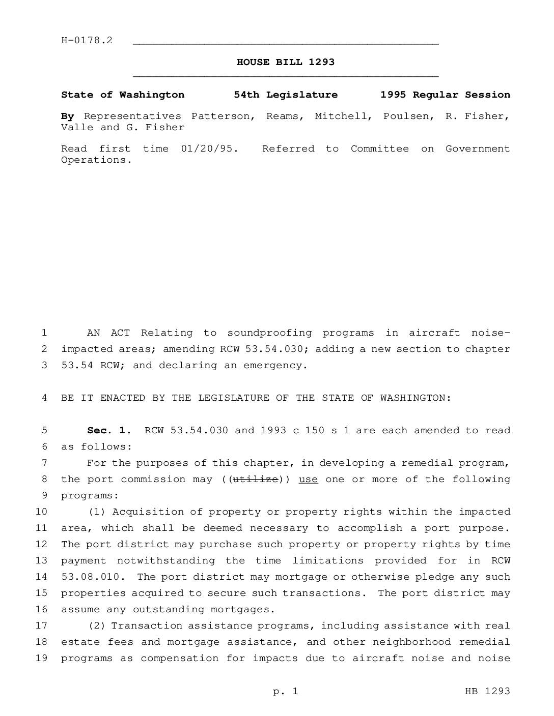 State of Washington 54th Legislature 1995 Regular Session By Representatives Patterson, Reams, Mitchell, Poulsen, R. Fisher, Valle and G. Fisher Read first time 01/20/95. Referred to Committee on Government Operations. AN ACT Relating to soundproofing programs in aircraft noise-1 impacted areas; amending RCW 53.54.030; adding a new section to chapter2 53.54 RCW; and declaring an emergency.3 BE IT ENACTED BY THE LEGISLATURE OF THE STATE OF WASHINGTON:4 Sec. 1. RCW 53.54.030 and 1993 c 150 s 1 are each amended to read5 as follows:6 For the purposes of this chapter, in developing a remedial program,7 the port commission may ((utilize)) use one or more of the following8 programs:9 (1) Acquisition of property or property rights within the impacted10 area, which shall be deemed necessary to accomplish a port purpose.11 The port district may purchase such property or property rights by time12 payment notwithstanding the time limitations provided for in RCW13 53.08.010. The port district may mortgage or otherwise pledge any such14 properties acquired to secure such transactions. The port district may15 assume any outstanding mortgages.16 (2) Transaction assistance programs, including assistance with real17 estate fees and mortgage assistance, and other neighborhood remedial18 programs as compensation for impacts due to aircraft noise and noise19 p. 1 HB 1293 associated conditions. Any such programs shall be in connection with1 properties located within an impacted area and shall be provided upon2 terms and conditions as the port district shall determine appropriate.3 (3) Programs of soundproofing structures located within an impacted4 area. ((Such programs… -
