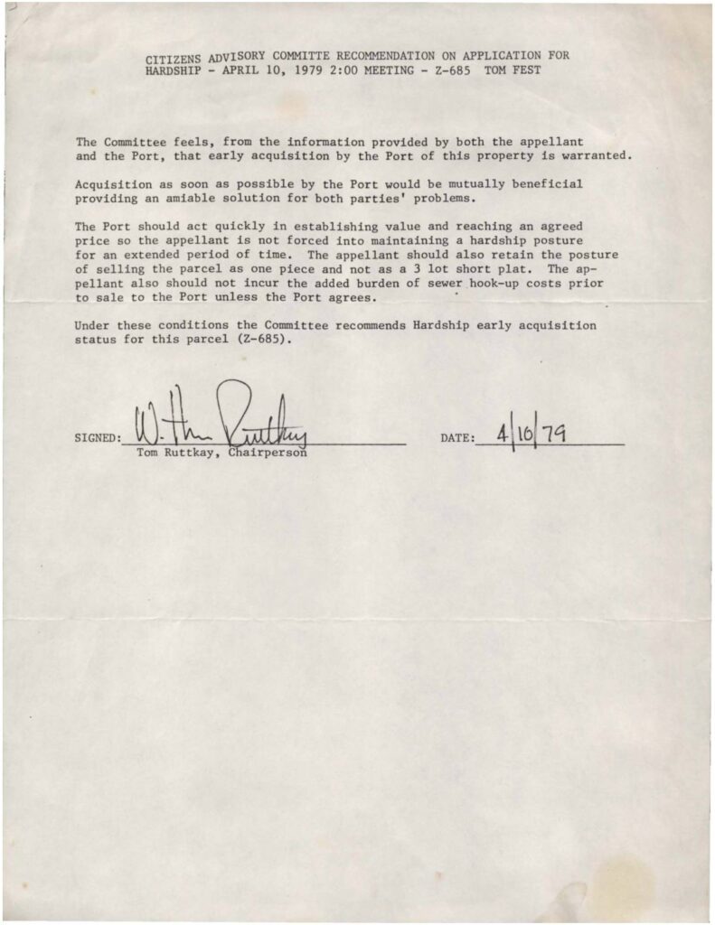 Citizens Advisory Committee recommendation supporting hardship early acquisition status for property Z-685 owned by Tom Fest. The Committee recommends the Port quickly establish value and reach an agreed price for mutual benefit of both parties.