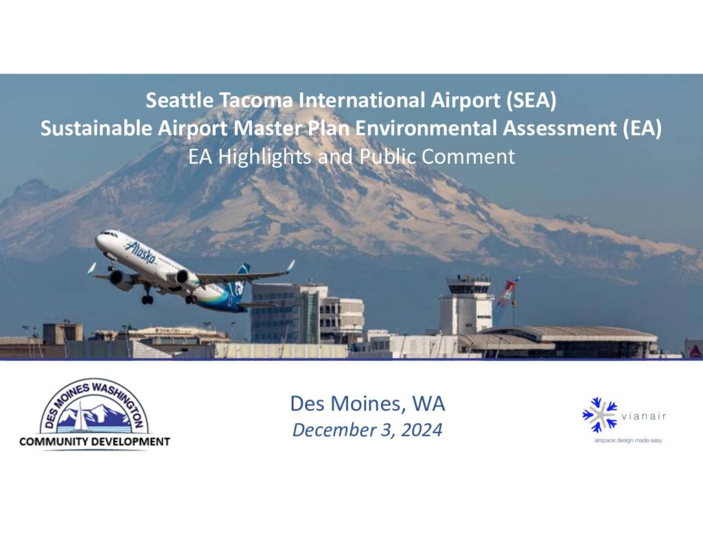 Sustainable Airport Master Plan Environmental Assessment (EA) EA Highlights and Public Comment Des Moines, WA December 3, 2024 AGENDAAGENDA Welcome SAMP Overview Highlights from the Environmental Assessment Next Steps Public Comment Discussion Sustainable Master Plan Update (SAMP)‐ Overview https://www.portseattle.org/plans/sustainable‐airport‐master‐plan‐samp Purpose and Need Five primary needs for the Near‐Term Projects have been identified: • Insufficient passenger terminal capacity to accommodate projected passenger levels efficiently • Insufficient facilities to accommodate projected cargo levels efficiently. • Non‐compliance with Federal Aviation Administration airport design guidelines. • Excessive aircraft delays on the airfield. (Insufficient airfield capacity) • Lack of fuel storage to meet projected demand and to meet the Port’s Sustainable Aviation Fuel initiative Purpose and Need – Current vs Forecast Demand 422,497 511,800 51 Million Million 100,000 200,000 300,000 400,000 500,000 600,000 2015 2016 2017 2018 2019 2020 2021 2022 2023 . . . 2032 2037 To ta l A nn ua l P as se ng er s (in m ili on s) To ta l A nn ua l F lig ht s Annual Flight Operations and Passengers Sources: Port of Seattle Environment and Sustainability & 2023 Annual Report and SEA SAMP DRAFT EA, Appendix A Total Annual Passenger data is rounded to nearest million. Approximate 20% increase in annual operations and passengers by 2032 Key Concepts Demand: the amount or volume of aircraft, pilots and passengers who want to use the airport facilities. Growth: the increase in total operations (take‐offs and landings, cargo and passengers) within a specified period. Capacity: the…