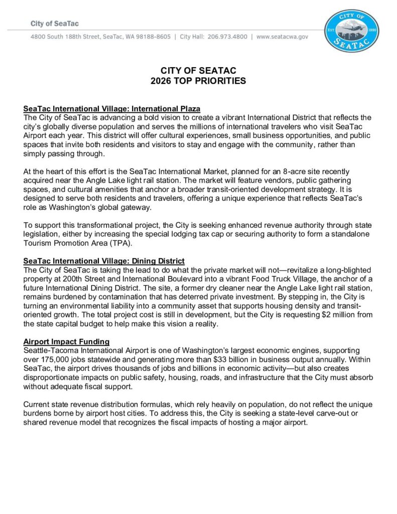 SeaTac’s 2026 legislative priorities including the International Village project with International Plaza and Dining District, airport impact funding requests, and policy issues covering fiscal sustainability, public safety, housing, and infrastructure needs.