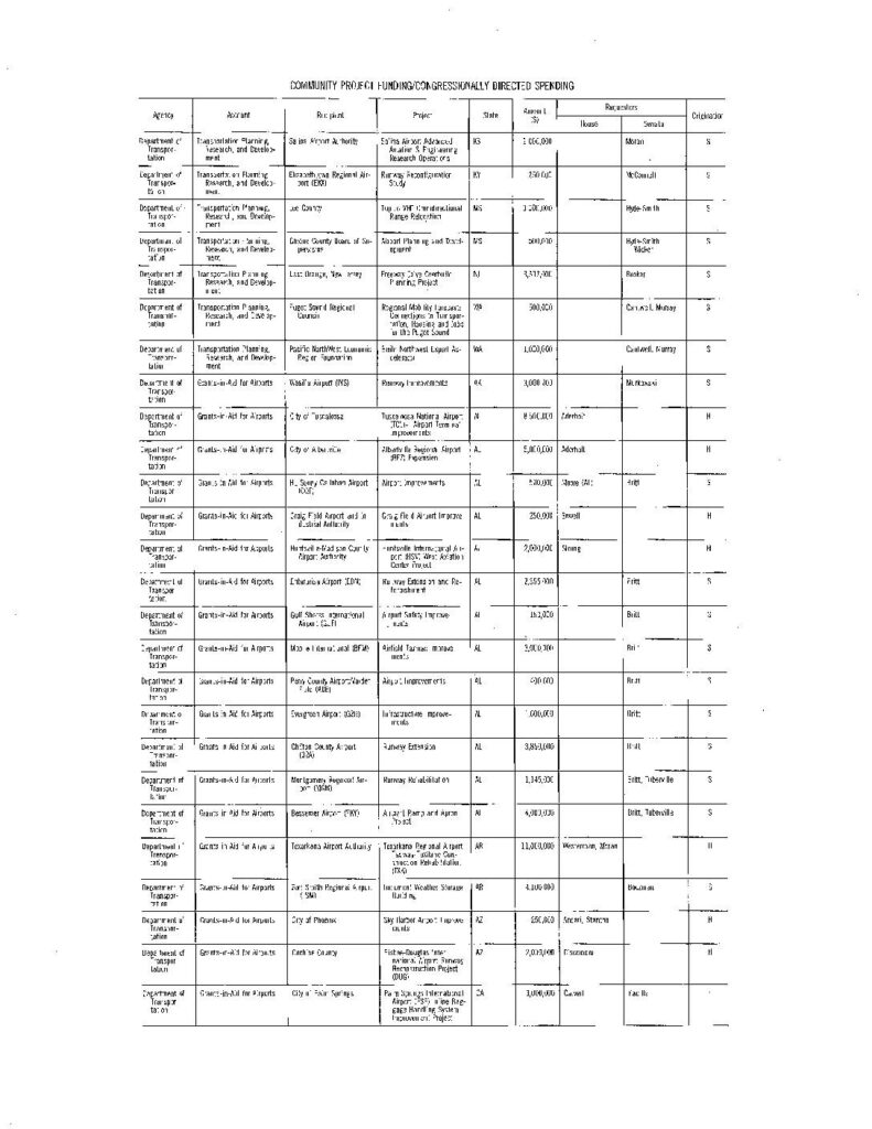 A comprehensive list of congressionally directed spending for Department of Transportation projects, including airport improvements, runway expansions, and aviation infrastructure projects across multiple states. The document details funding amounts, recipients, and the congressional representatives who requested each project.