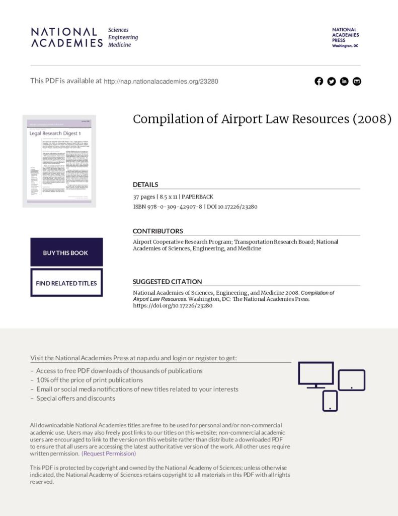 A comprehensive legal research digest that compiles and indexes airport law resources for attorneys and administrators. It provides a bibliography of federal resources, statutory materials, regulations, case law, and secondary sources related to airport legal issues including topics like eminent domain, environmental concerns, leasing, contracting, security, and liability.