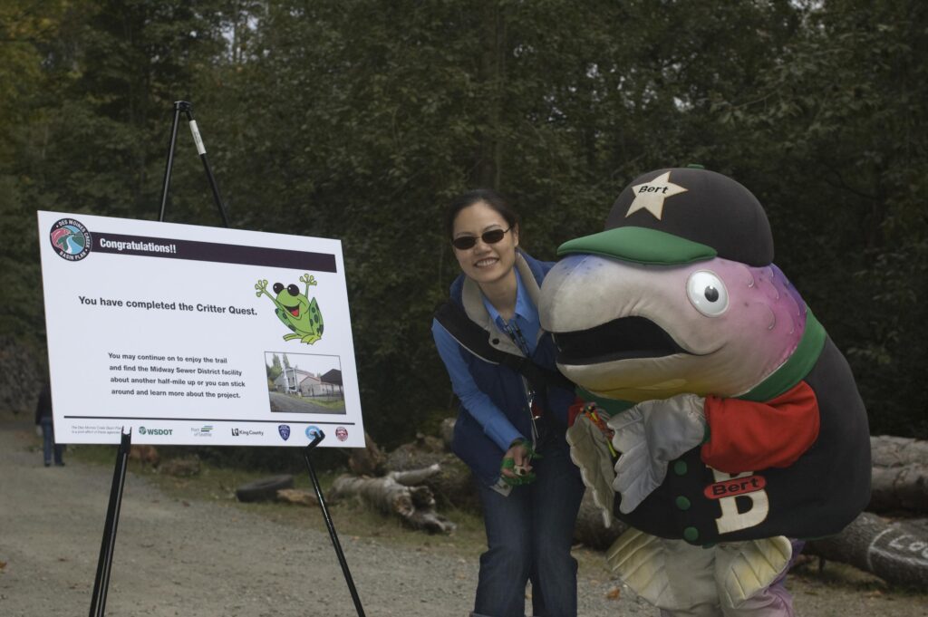 A congratulatory sign for completing the Critter Quest trail activity with a woman posing next to a large mascot character. The sign mentions continuing to enjoy the trail and finding the Midway Sewer District facility.