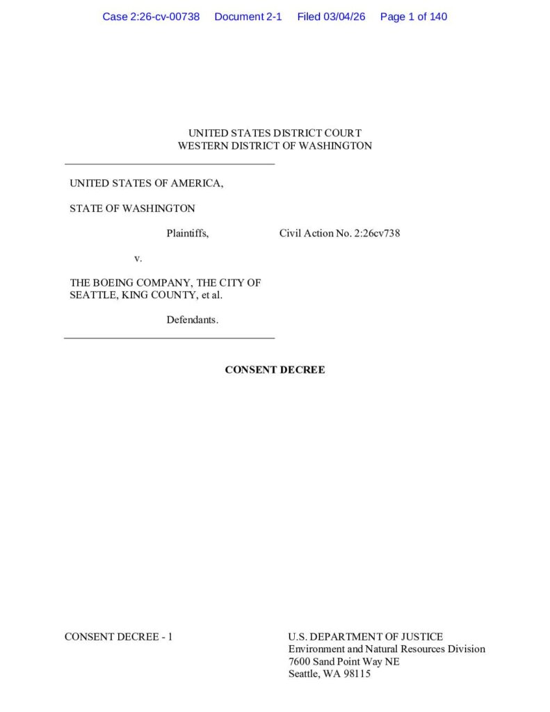 A consent decree filed in federal court establishing terms for environmental remediation of the Lower Duwamish Waterway Superfund Site in Seattle, WA. The decree involves the United States, State of Washington as plaintiffs against Boeing, Seattle, King County and other defendants under CERCLA and Washington State Model Toxics Control Act.