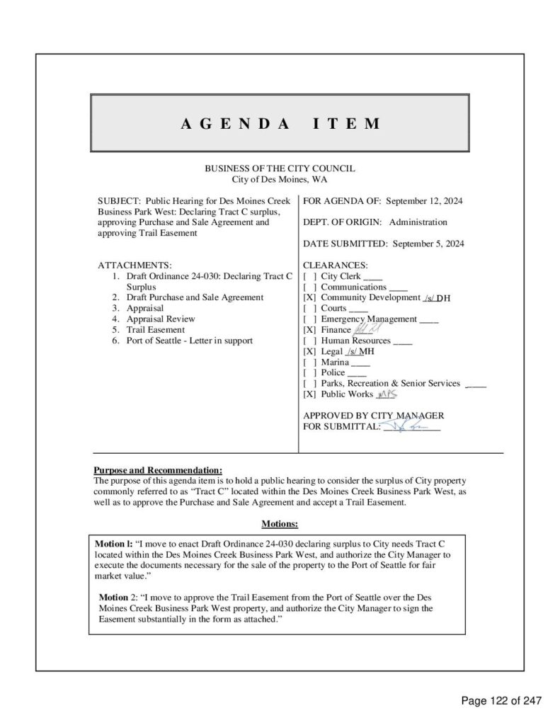 SUBJECT: Public Hearing for Des Moines Creek Business Park West: Declaring Tract C surplus, approving Purchase and Sale Agreement and approving Trail Easement ATTACHMENTS: 1. Draft Ordinance 24-030: Declaring Tract C Surplus 2. Draft Purchase and Sale Agreement 3. Appraisal 4. Appraisal Review 5. Trail Easement 6. Port of Seattle - Letter in support FOR AGENDA OF: September 12, 2024 DEPT. OF ORIGIN: Administration DATE SUBMITTED: September 5, 2024 CLEARANCES: [ ] City Clerk ____ [ ] Communications ____ [X] Community Development ____ [ ] Courts ____ [ ] Emergency Management ____ [X] Finance ____ [ ] Human Resources ____ [X] Legal ____ [ ] Marina ____ [ ] Police ____ [ ] Parks, Recreation & Senior Services ____ [X] Public Works ____ APPROVED BY CITY MANAGER FOR SUBMITTAL: ____________ Purpose and Recommendation: The purpose of this agenda item is to hold a public hearing to consider the surplus of City property commonly referred to as “Tract C” located within the Des Moines Creek Business Park West, as well as to approve the Purchase and Sale Agreement and accept a Trail Easement. Motions: