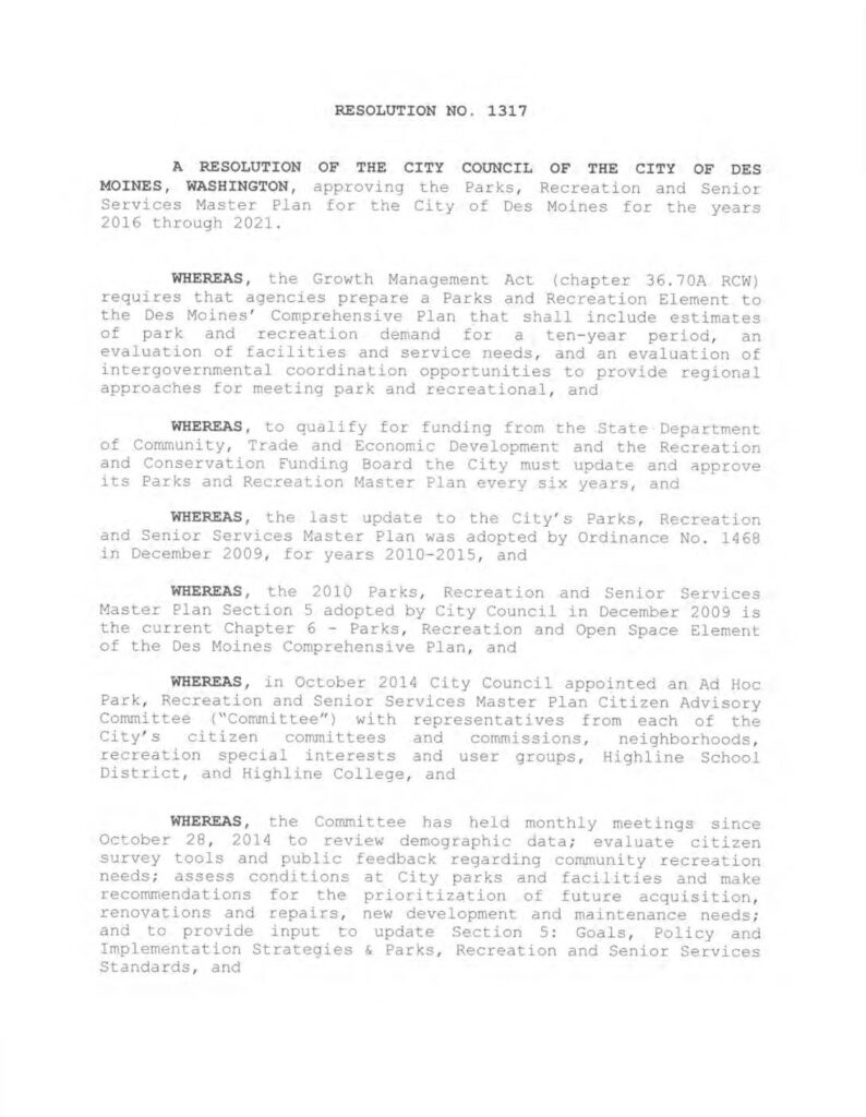 Des Moines Resolution No. 1317 – approving the Parks, Recreation and Senior Services Master Plan for the City for the years 2016 through 2021