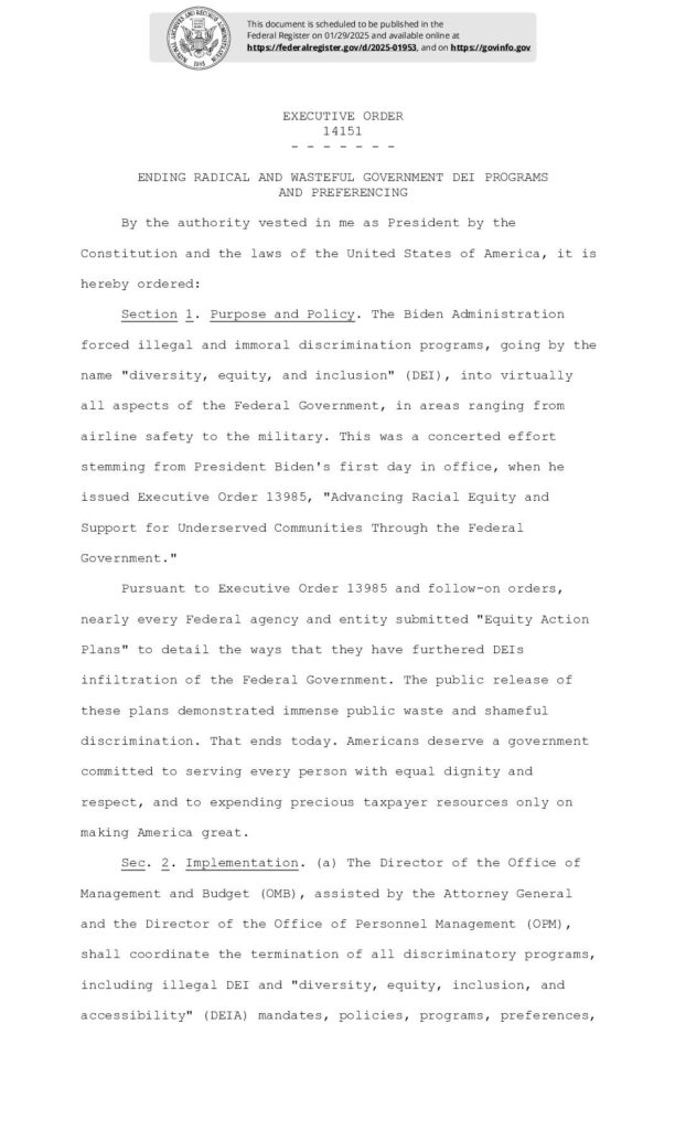 Executive Order 14151 issued to terminate all federal diversity, equity, and inclusion (DEI) programs, offices, and policies across government agencies. The order directs agencies to eliminate DEI positions, equity action plans, and related training within 60 days while requiring assessments of operational impacts and costs.