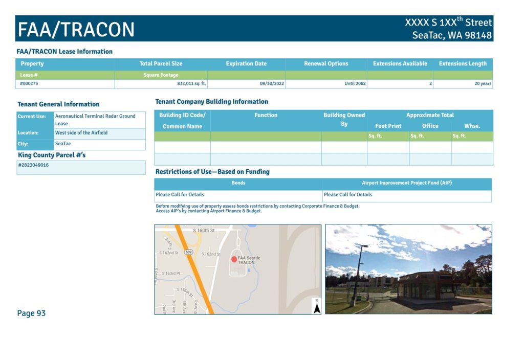 Property Total Parcel Size Expiration Date Renewal Options Extensions Available Extensions Length Lease # Square Footage #000273 832,011 sq. ft. 09/30/2022 Until 2062 2 20 years FAA/TRACON Building ID Code/ Common Name Function Building Owned By Approximate Total Foot Print Office Whse. Sq. ft. Sq. ft. Sq. ft.