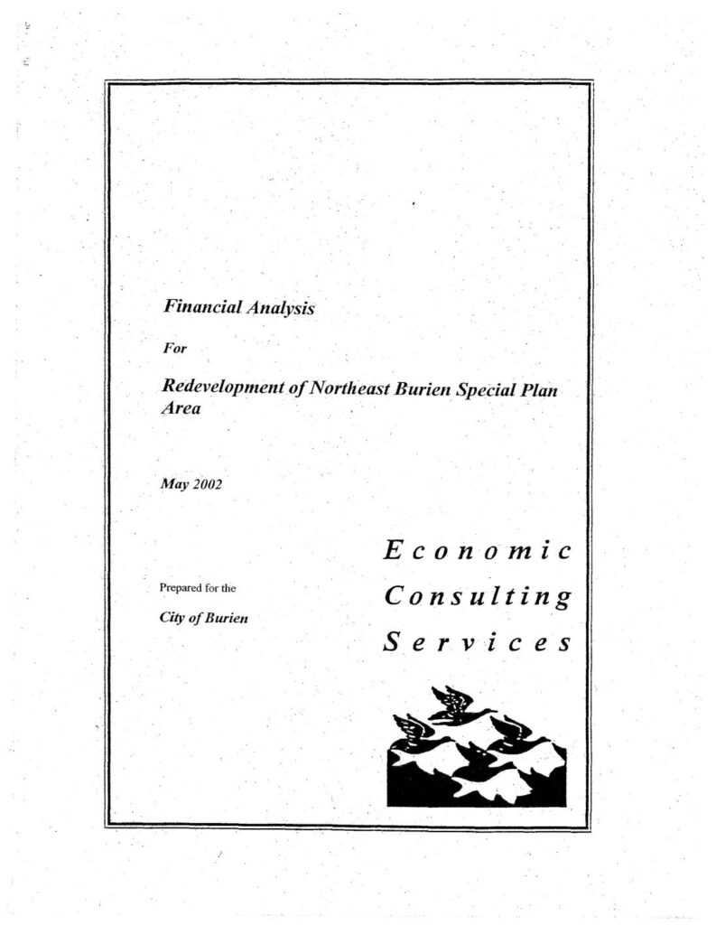 A financial analysis report prepared by Economic Consulting Services for the City of Burien regarding the redevelopment of the Northeast Burien Special Plan Area. The report was completed in May 2002 and includes economic analysis and consulting services for the redevelopment project.