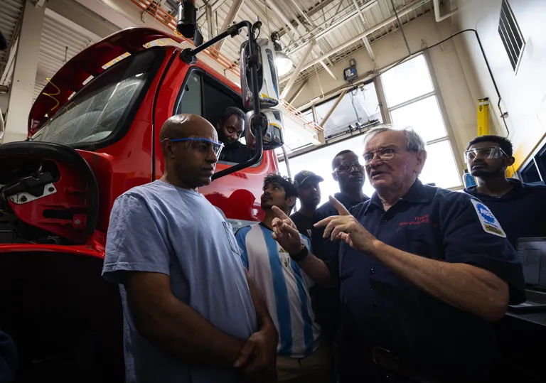 Image shows what appears to be a community visit to a fire station, with several people including children gathered around fire equipment. An older man in what appears to be uniform is demonstrating or explaining equipment to the group in what looks like a fire station bay.