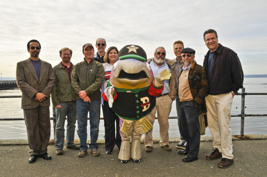 A group photo showing approximately 10 people of various ages standing together at what appears to be a waterfront or pier location. The group includes a mascot character dressed as a sheriff or law enforcement officer with a star badge. The photo appears to be taken during daytime with water visible in the background.