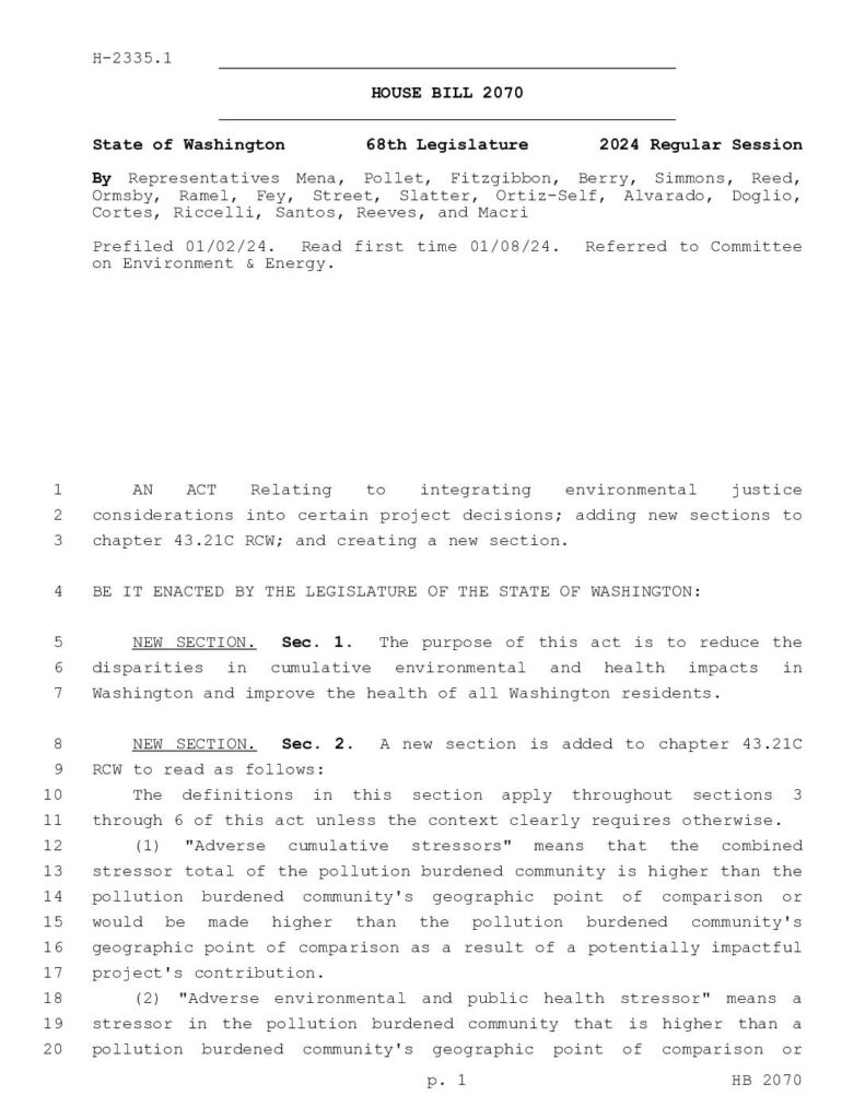 Primary sponsor: Sharlett Mena Tacoma. Integrating environmental justice considerations into certain project decisions. Companion Bill SB5990