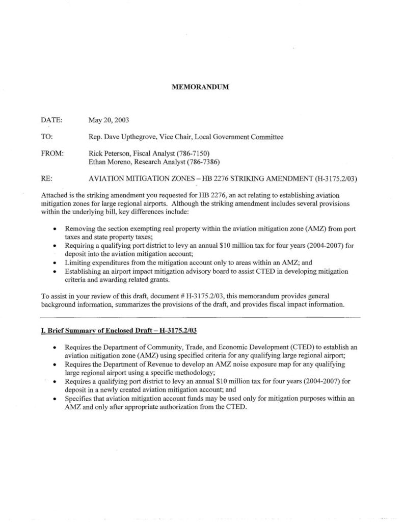 Legislative memorandum analyzing a striking amendment to HB 2276 that establishes aviation mitigation zones for large regional airports. The amendment requires qualifying port districts to levy $10 million annually for four years (2004-2007) for mitigation purposes and creates an advisory board to assist with grant distribution.