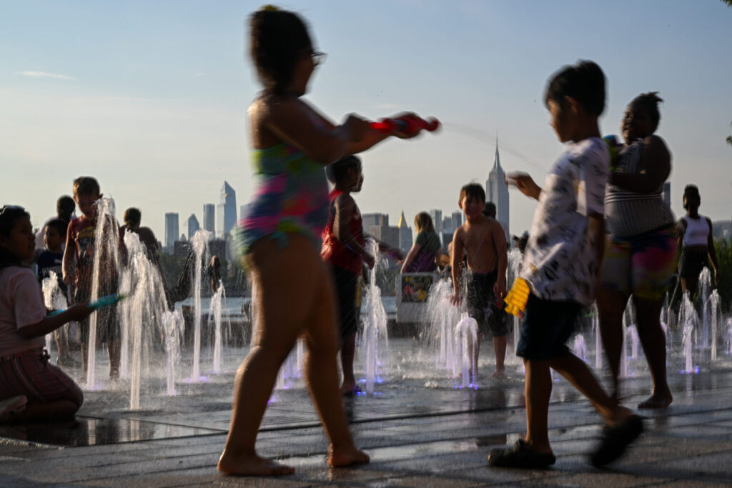 NEW YORK, NEW YORK - JULY 24: Children spray each other with water and cool off by playing in a fountain in Domino Park, Brooklyn with the Manhattan skyline in the background as the sun sets during a heat wave on July 24, 2022 in the Brooklyn borough of New York City. The five boroughs of New York City are under a heat advisory until 8 PM on July 24th according to the US National Weather Service. Much of the East Coast is experiencing higher than usual temperatures as a heat wave moves through the area forcing residents into parks, pools and beaches to escape the heat. (Photo by Alexi Rosenfeld/Getty Images)