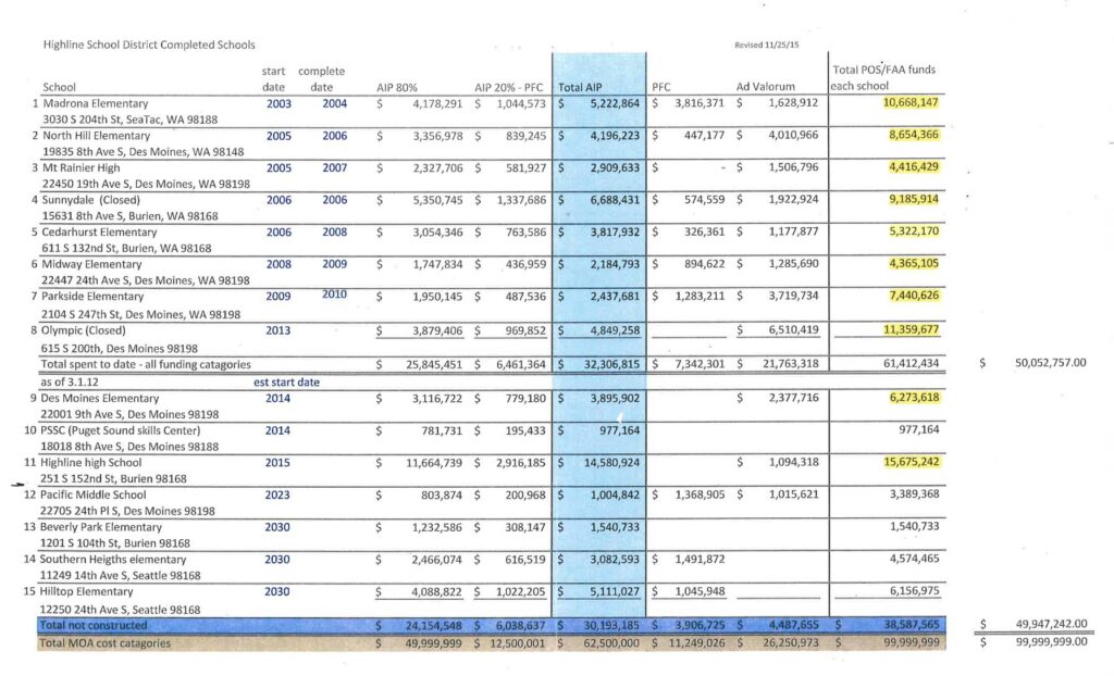 3030 S 204th St, SeaTac, WA 9B1BB North Hill Elementary 1-9835 8th Ave S, Des Moines, WA 98148 Mt Rainier High 22450 L9th Ave S, Des Moines, WA 98198 sta rt date complete date AtP 80% AIP 20% - PtC TotalAlP PFC Revised 11l25l15 Ad Valorum Total POS/FAA funds each school r0,668,L47 8,654,366 4,4L6,429 9,L85,91_4 5,322,t70 4,365,L05 7,440,626 11,359,677 Sunnydale (Closed) L563L 8th Ave S, Burien, WA 98168 2003 2004 $ 4,178,291, 5 1,044,573 2005 2006 $ 3,356,978 $ 839,245 2005 2007 5 2,327,706 5 581,,927 2006 2006 s 5,350,745 5 1",337,686 Ð Cedarhurst Elementary 6L1- S 132nd St, Burien, WA 98L68 Midway Elementary 22447 24th Ave S, Des Moines, WA 98198 Parkside Elementary 2IA4 S 247th St, Des Moines, WA 98L98 B Olympic (Closed) 615 S 200th, Des Moines 98L98 Total spent to date - all fundi cata fles as of 3.L.12 Des Moines Elementary 220OI9th Ave S, Des Moines 98198 1"0 PSSC (Puget Sound skills Center) L8018 Bth Ave S, Des Moines 9B1BB lL Highline high School 25L S 152nd St, Burien 98L68 Pacific Middle School 22705 24th PlS, Des Moines 98198 L3 Beverly Park Elementary 1201S l-04th St, Burien 98168 Southern Heigths elementary II249 14th Ave S, Seattle 98L68 L5 Hilltop Elementary 12250 24th Ave S, Seattle 981-68 2006 2008 5 3,054,346 $ 763,586 2008 2009 s 1",747,834 $ 436,959 2009 5 1,950,145 S 487,536 2013 5 3,879,406 $ gog,gsz 2s,845,45L 5 6,46r,364 est start date 2014 5 3,116,722 $ 779,LBo 20L4 5 781,131" 5 195,433 2015…