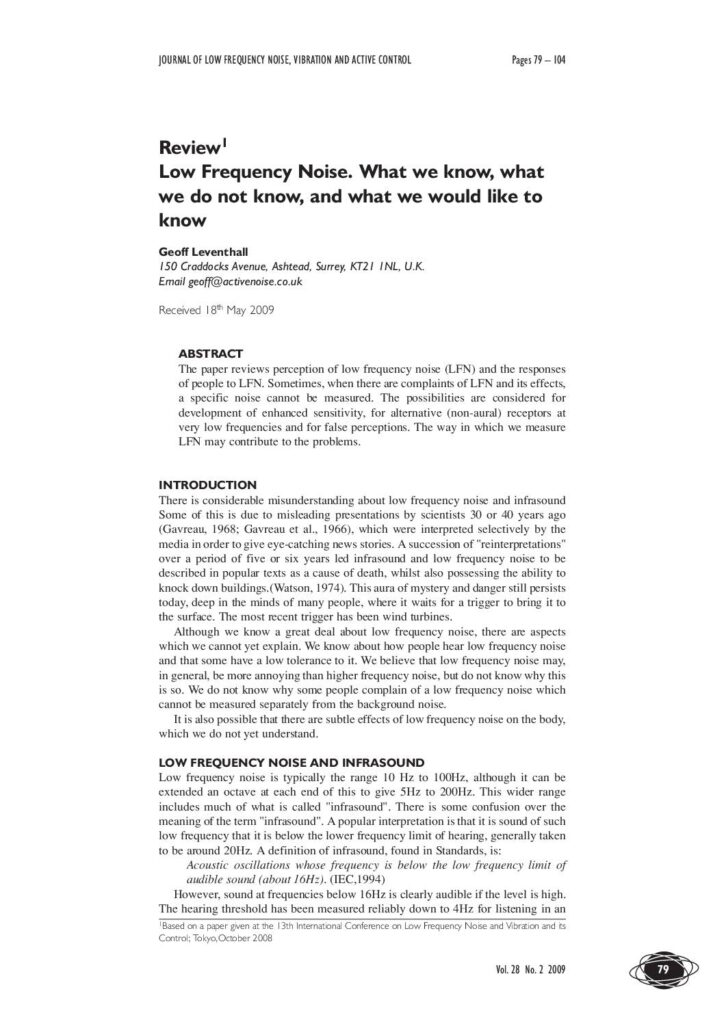 Academic review paper examining perception of low frequency noise and infrasound, including human responses, measurement challenges, and the historical misconceptions that have created public fear around these sound phenomena. The paper addresses hearing thresholds, sensitivity variations, and unexplained complaints of low frequency noise.