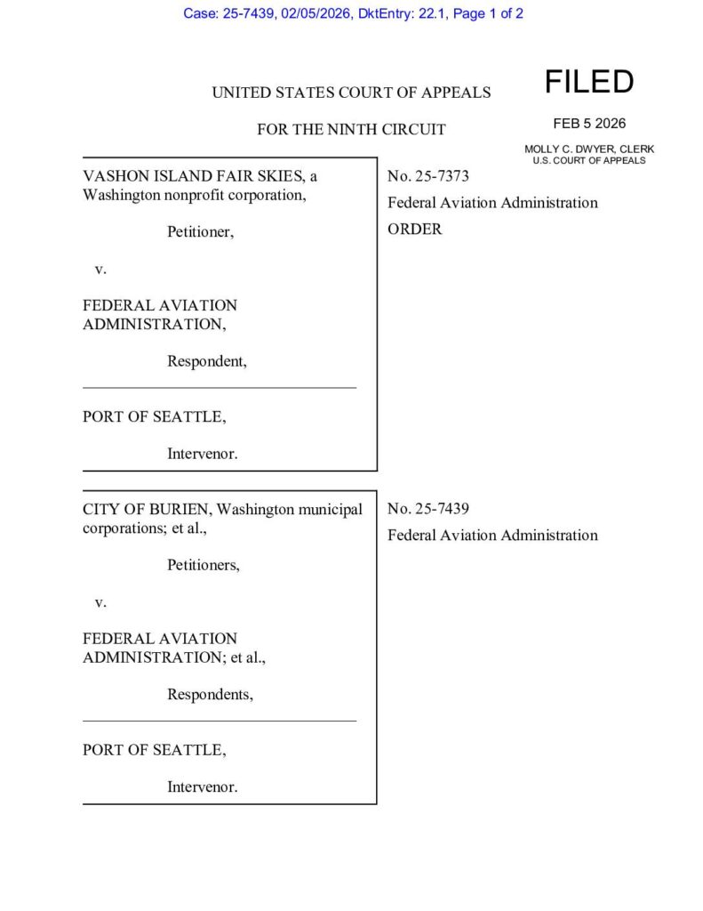 Court order from the Ninth Circuit Court of Appeals addressing two consolidated cases involving Vashon Island Fair Skies and City of Burien challenging the Federal Aviation Administration. The order denies motions for separate opening briefs and oversized briefs, while establishing deadlines for consolidated briefing.