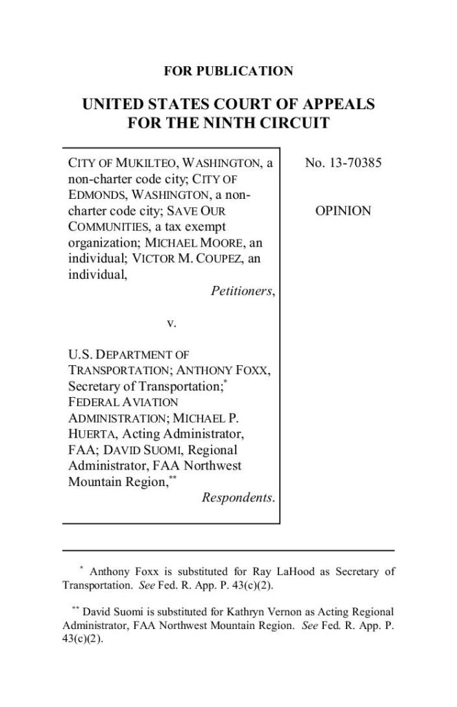 Petitioners challenged the FAA’s decision that no Environmental Impact Statement (EIS) is necessary to commence operating commercial passenger service at Paine Field in Snohomish County. The court held that the scope of the FAA’s demand-based projections were not arbitrary and capricious. In this case, the FAA determined that there were no connected actions for this project and petitioners have failed to provide anything more than mere speculation that the FAA’s actions now will lead to more aircraft activity at Paine Field in the future than covered in the Environmental Assessment (EA). Therefore, it was not arbitrary for the FAA to have included no connected actions in the final EA. The court also concluded that the FAA’s Finding of No Significant Impact was not predetermined by the creation of an optimistic schedule for completing the environmental review or statements favoring commercial service at Paine Field. Here, the FAA performed its National Environmental Policy Act (NEPA), 42 U.S.C. 4321-4370h, obligations in good faith and did not prematurely commit resources to opening the terminal. Accordingly, the court denied the petition for review.