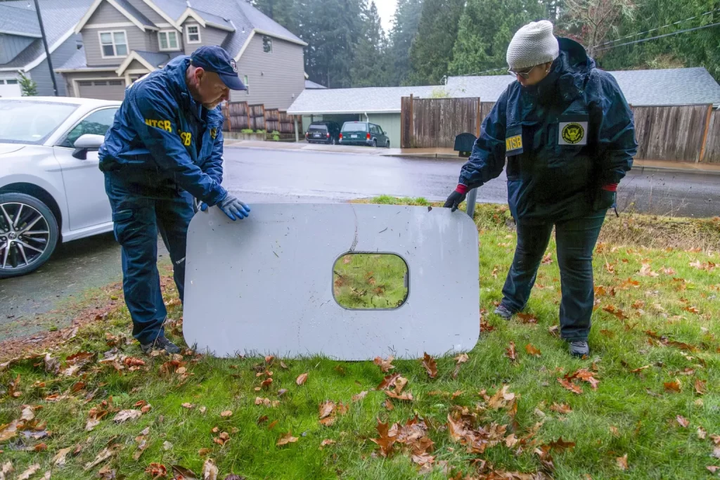 Two NTSB investigators in protective gear examine what appears to be aircraft debris or parts on grass in a residential area. The investigators are wearing blue coveralls with NTSB patches and are carefully handling what looks like a white aircraft component with a rectangular opening.