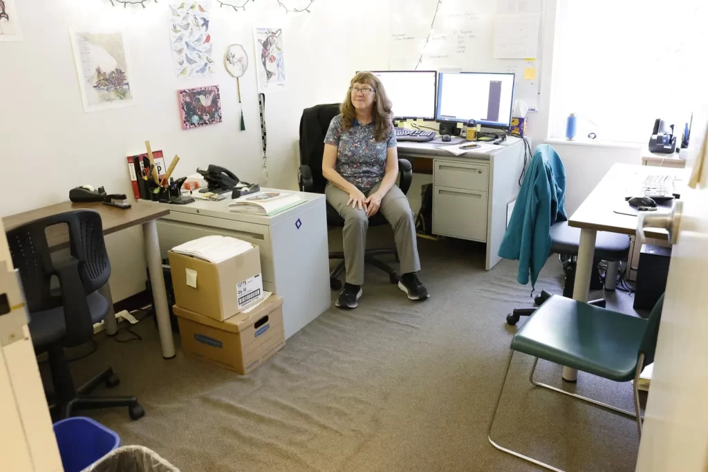 An office workspace showing a woman sitting at a desk chair in what appears to be a professional office environment. The space contains typical office furniture including desks, chairs, filing cabinets, computers, and has various papers and materials posted on the walls including what appear to be charts or diagrams.