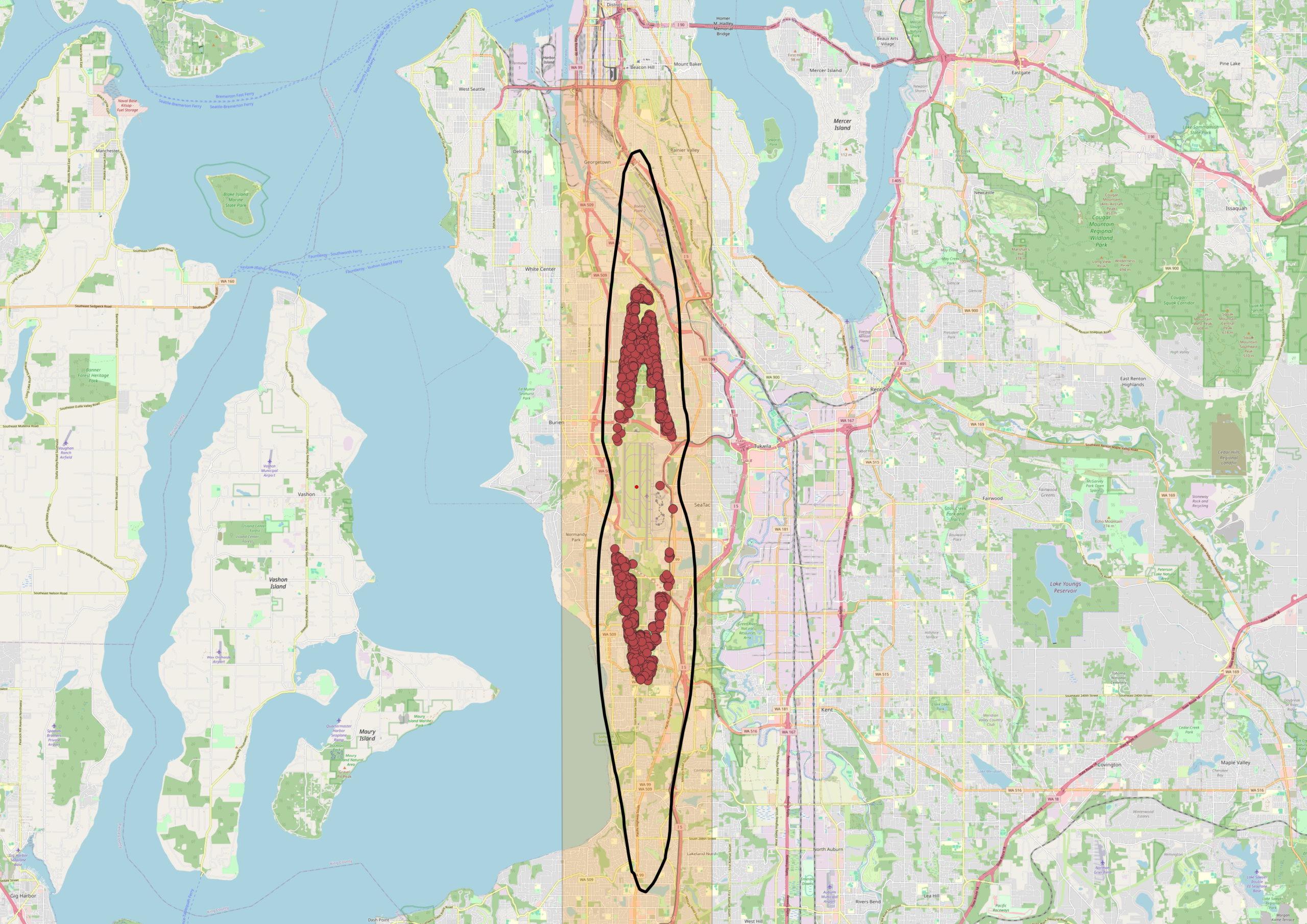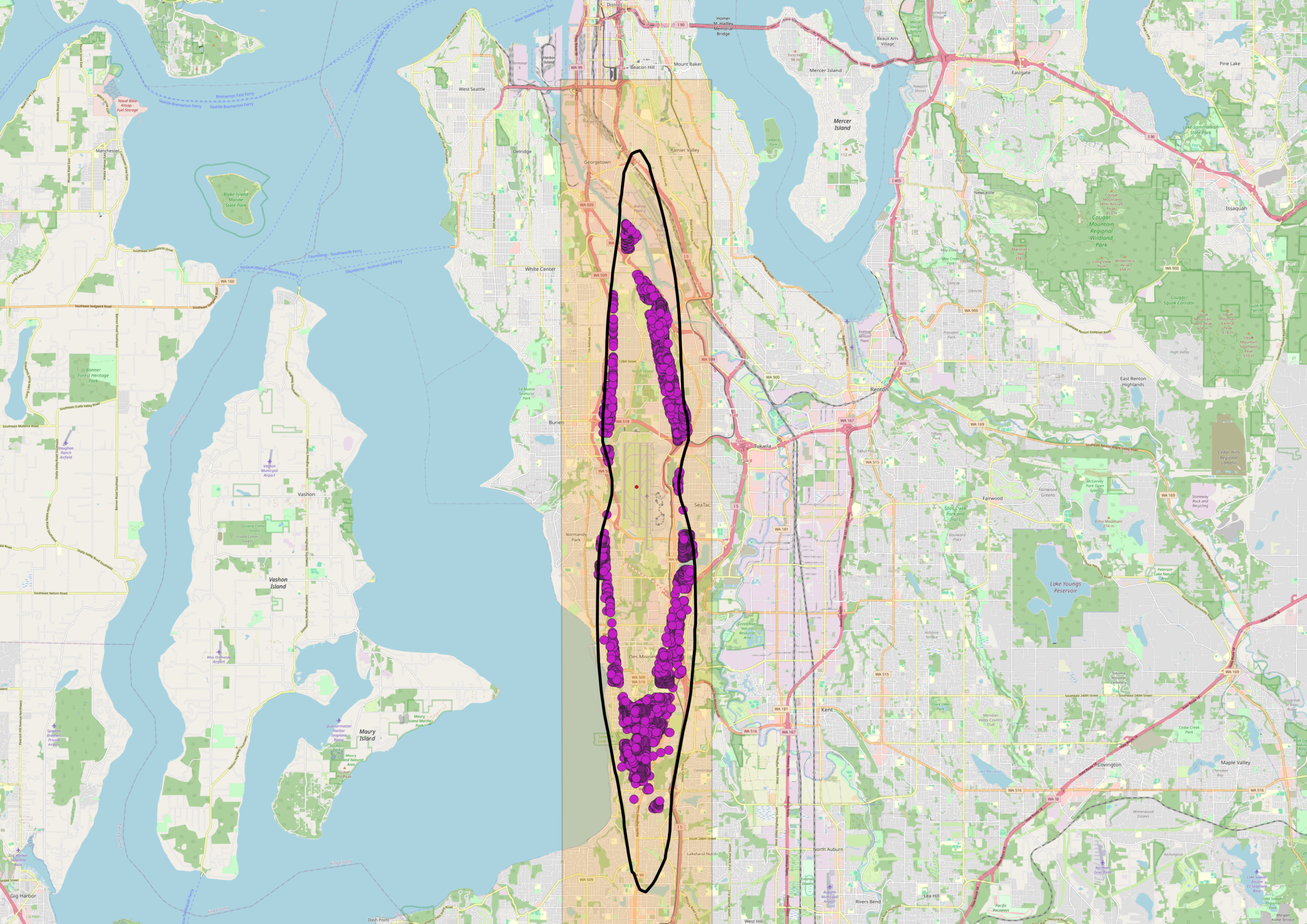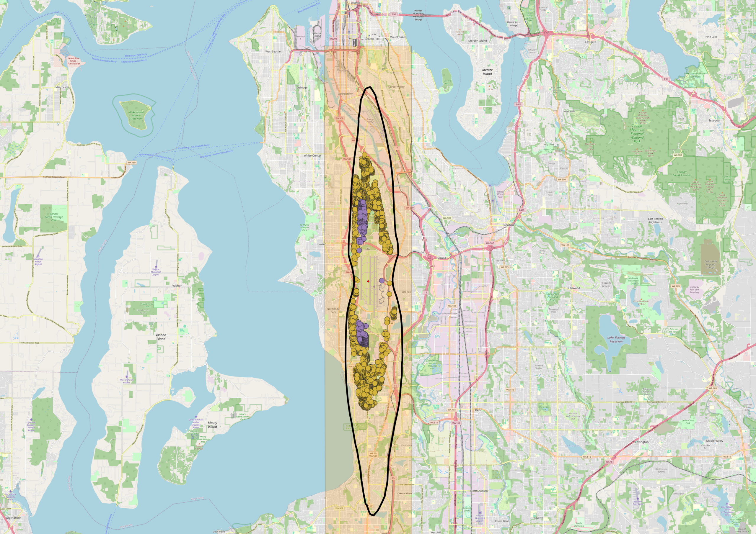 - The light orange rectangle is the 92 sq mile area defined under State of Washington law (RCW 53.54.020) that is eligible for funding to mitigate noise impacts–but only those generated by Sea-Tac Airport.