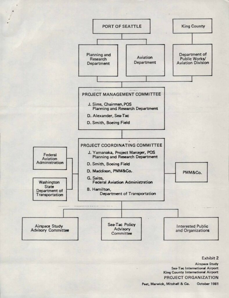 Organizational chart showing the project structure for the Airspace Study of Sea-Tac International Airport and King County International Airport. Shows the management hierarchy including Port of Seattle, King County, FAA, and Washington State Department of Transportation involvement.