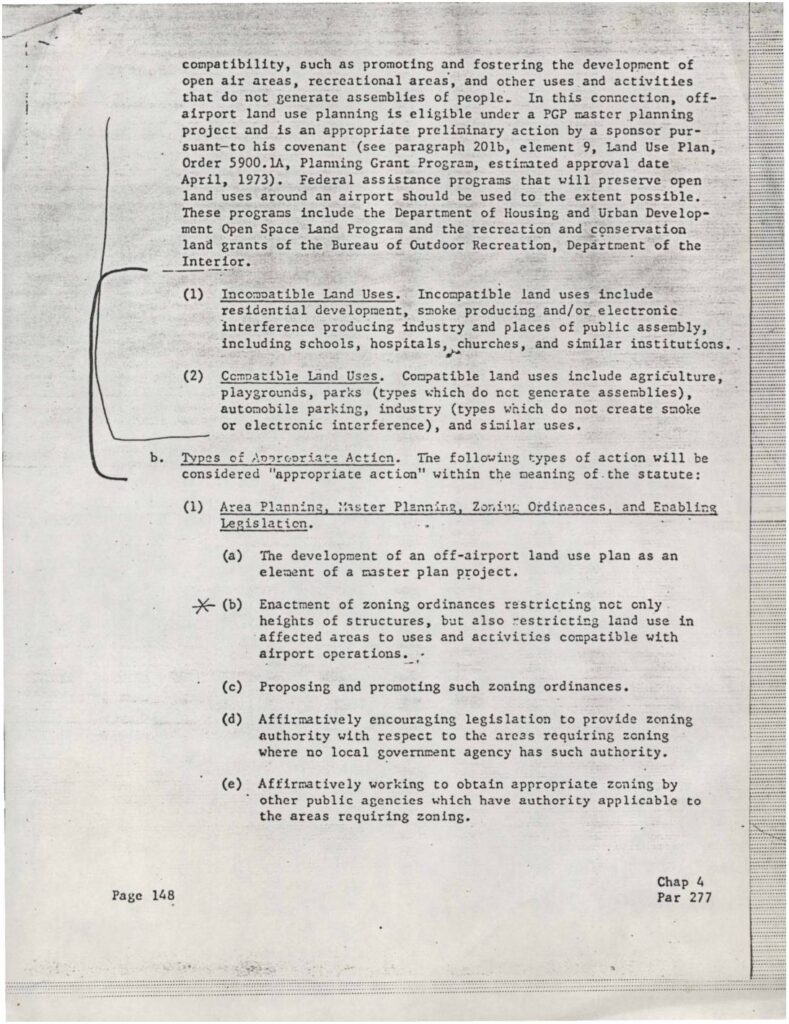 Federal aviation guidance document outlining compatible and incompatible land uses around airports, and appropriate actions for airport sponsors including zoning ordinances, master planning, and land use planning to ensure airport-compatible development.