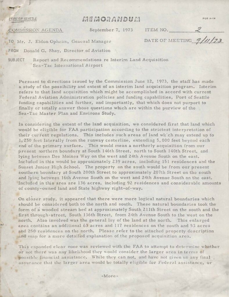 Port of Seattle staff report recommending interim land acquisition program for Sea-Tac Airport clear zones, including 610 residential parcels and 75 acres with estimated value of $15.46 million. The report outlines FAA funding participation, natural boundaries, and implementation timeline through 1977.