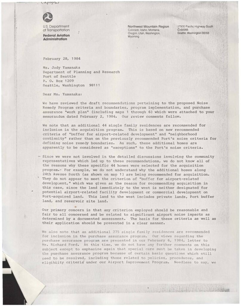 Letter from FAA Northwest Mountain Region to Port of Seattle reviewing draft recommendations for the Noise Remedy Program criteria and boundaries. The FAA expresses concerns about additional 44 single family residences recommended for acquisition based on ‘buffer’ and ‘neighborhood continuity’ criteria rather than noise criteria, and raises questions about the purchase assurance program for 275 additional residences.