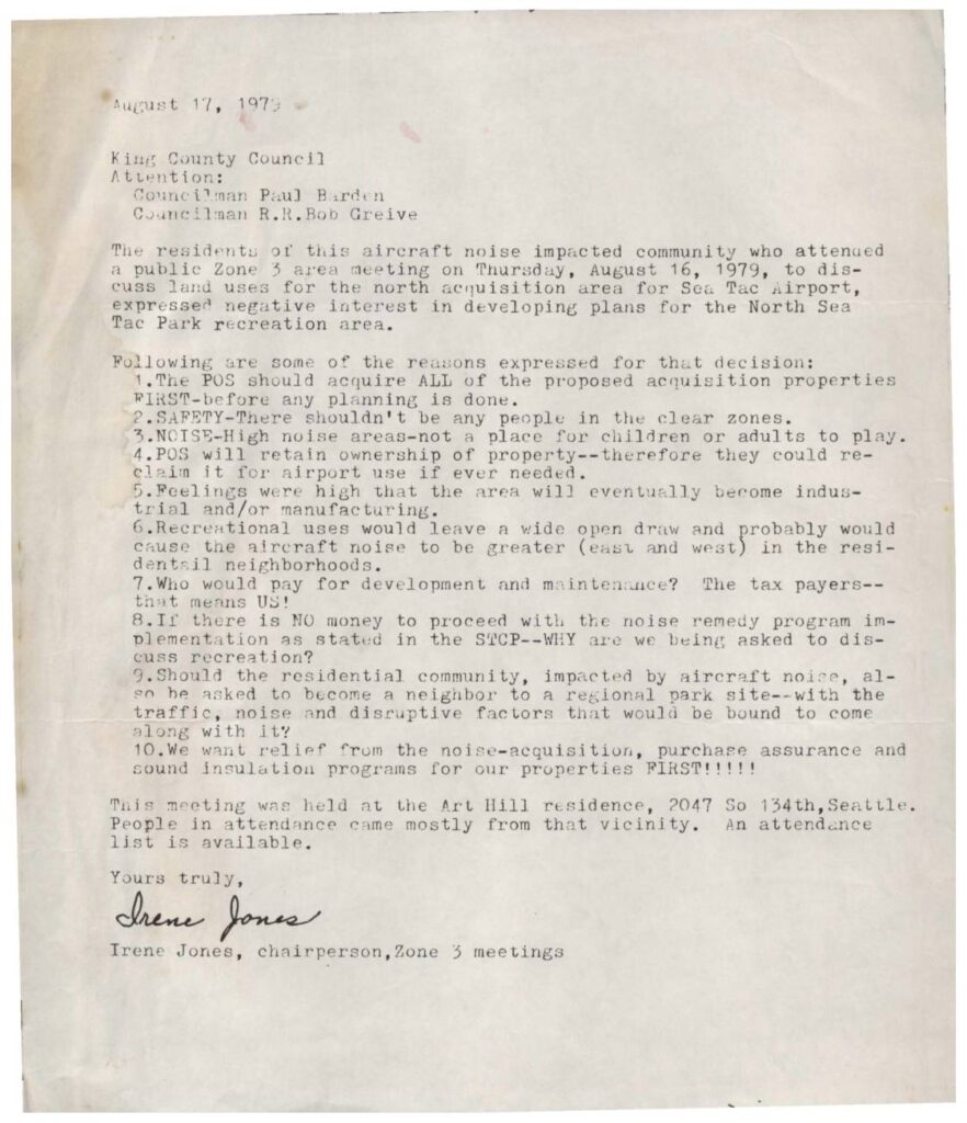 Letter from Zone 3 aircraft noise impacted community residents to King County Council expressing opposition to plans for North Sea-Tac Park recreation area. Residents list 10 reasons for their opposition including safety concerns, noise issues, and preference for property acquisition and noise remedy programs first.