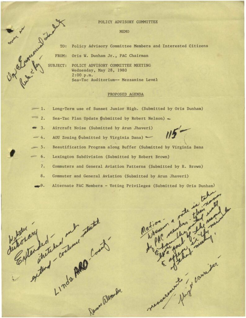 Meeting agenda for Policy Advisory Committee meeting on May 28, 1980 at Sea-Tac Mezzanine. Nine agenda items include long-term use of Sunset Junior High, Sea-Tac Plan Update, aircraft noise, zoning issues, beautification programs, and aviation patterns.