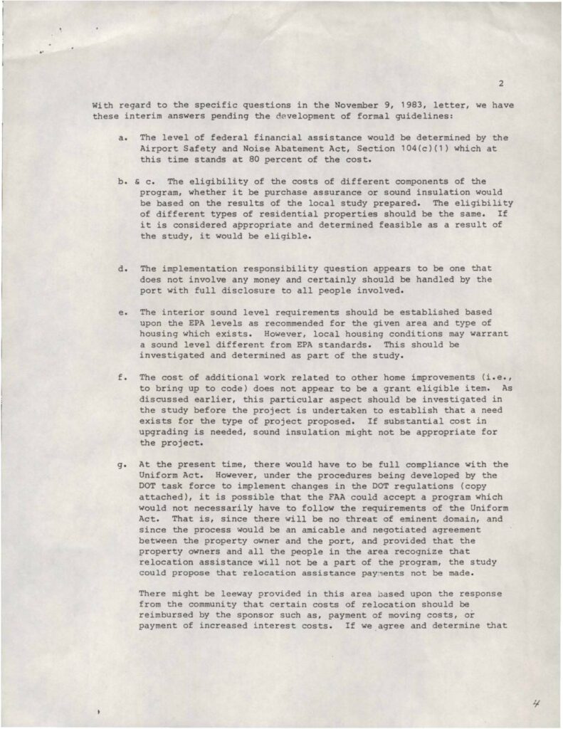 FAA response providing interim answers to Port of Seattle questions about noise remedy programs, including federal funding levels, eligibility criteria, and implementation responsibilities. The letter addresses purchase assurance and sound insulation programs under the Airport Safety and Noise Abatement Act.